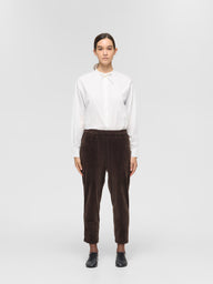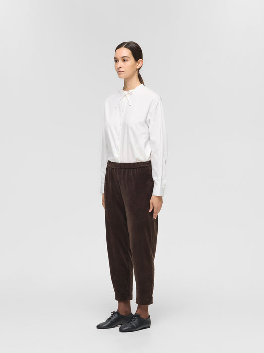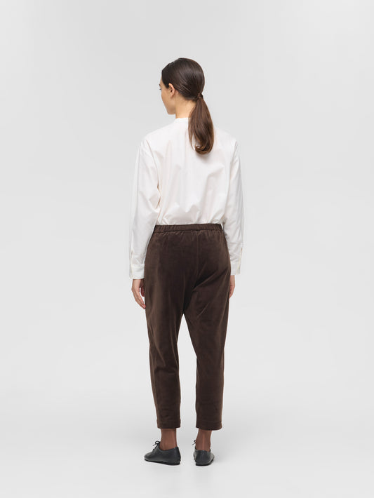 柔らかなベロア素材を使用したイージーパンツです。裏起毛仕様で暖かく、滑らかな肌触りが心地よい1枚。レギンスのようなすっきりとしたシルエットが特徴で、脚のラインを美しく見せながら快適な履き心地を実現します。8分丈のデザインが足元に抜け感をプラスし、ブーツやスニーカーとの相性も抜群。トップスを選ばず、ワンピースとも相性が良くカジュアルにもきれいめにも合わせやすい万能アイテムです。とても暖かく寒い季節に活躍します。サイドポケットはございません。同素材でシャツ(4-210034 / velour round colllar shirt)も展開。