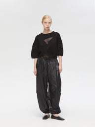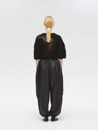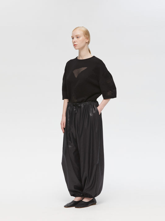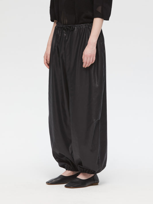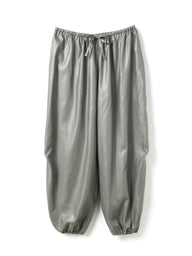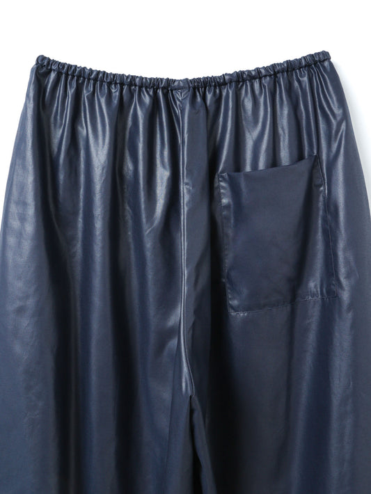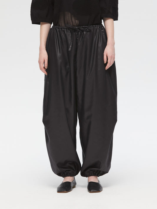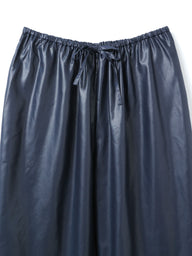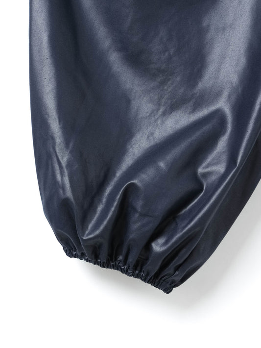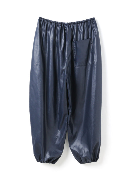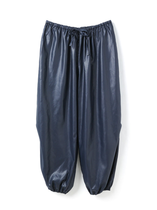 ワックスオイルを塗り込んだオイルドコットンをイメージした、落ち着いた光沢感のある風合いが魅力。裾にゴムを入れ、サイドにタックを施すことで、自然な丸みのあるシルエットを演出します。ウエストはゴムとドローストリングのイージー仕様で、リラックスした穿き心地。たっぷりとしたボリューム感が印象的なスタイルを叶えます。合繊素材ならではの軽やかさがあり、取り扱いやすく、暑い季節からオールシーズン着用いただけます。サイドとバックにポケット付き。裏地なし。