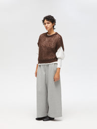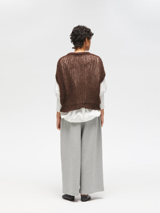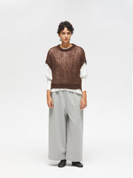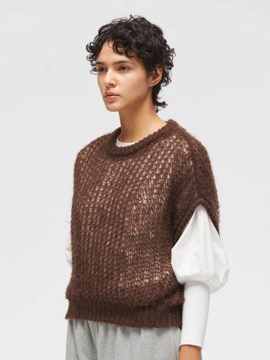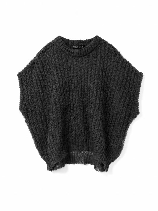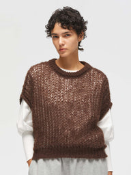 甘撚りのモヘヤ糸でふっくらと編み立てた、存在感のあるニットベストです。ワイドでコクーンなシルエットが立体感を生み出し、羽織るだけで雰囲気のあるスタイルを演出。パンクテイストを取り入れたモードなデザインは、シンプルなコーディネートに重ねるだけで一気に個性をプラスしてくれます。ポリエステル素材を使用しながらもウールライクな質感を実現し、ご自宅で洗えるウォッシャブル仕様でお手入れも簡単。トレンド感と実用性を兼ね備えた、デイリーに取り入れやすいバリューアイテムです。