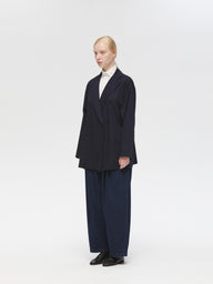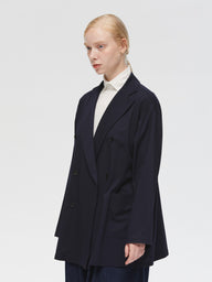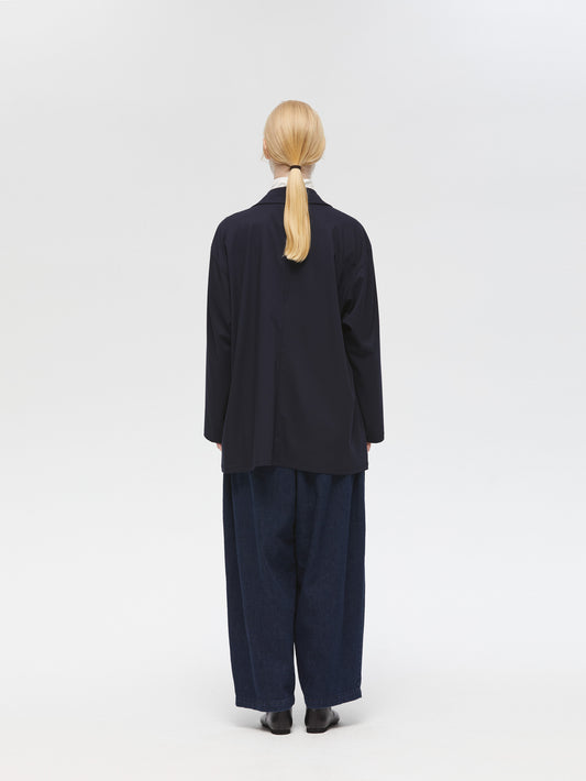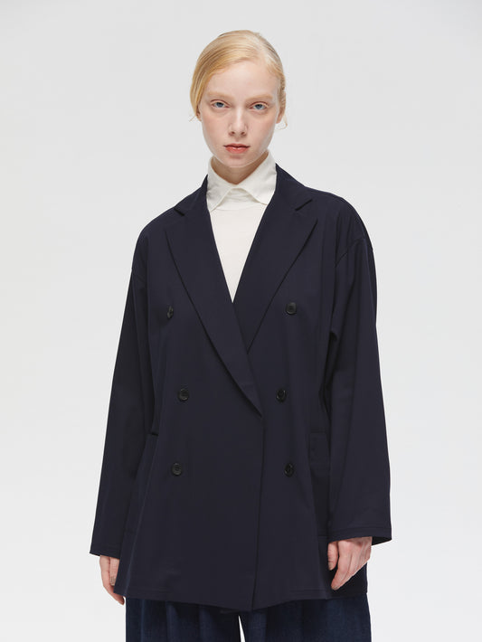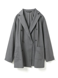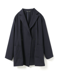 ダブルブレストのデザインとゆったりとしたシルエットが印象的なジャケット。シャツのように気軽に羽織れる軽やかさが魅力です。フロントのボタンは飾り仕様で、全体をすっきりと見せつつ、リラックス感のある着こなしを叶えます。落ち感のあるシルエットが抜け感を生み、かっこよさと程よいラフさを兼ね備えたスタイルを演出。さらりとした素材感で季節を問わず着用しやすく、デイリーで使いやすく上品なスタイルで着用いただけます。シンプルながら存在感があり、羽織るだけでスタイルを引き締めてくれる一枚です。同素材のパンツ(3-260072 / wide easy PT)とセットアップもおすすめ。