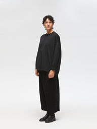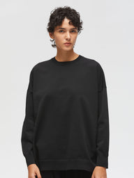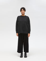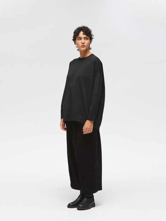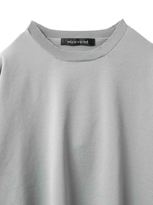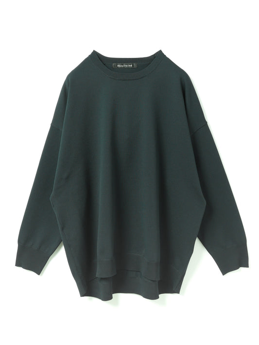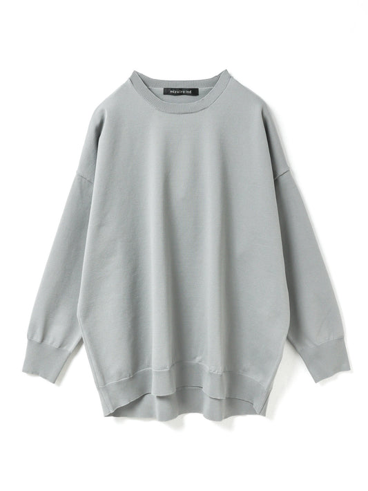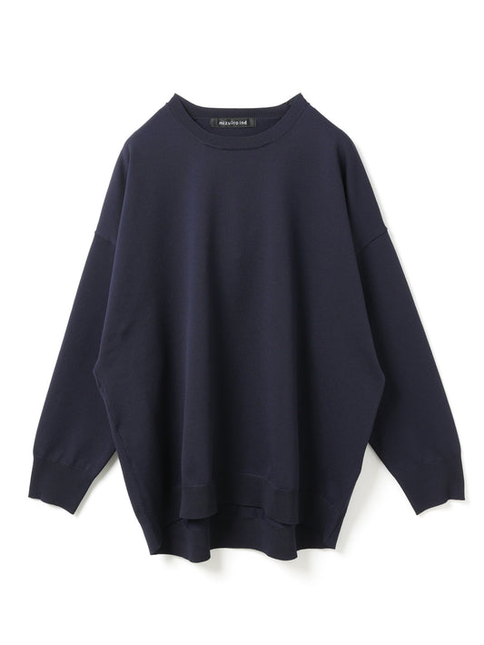 mizuiro ind定番シリーズのトレーナーを、ニットで表現したワイドプルオーバーです。ゆったりとしたワイドなサイズ感が特徴で、ヒップの隠れるロング丈に前後差をつけた丸みのあるラウンドヘムデザインがポイント。すっきりとしたクルーネックリブが女性らしさを演出し、太めの袖リブはロールアップもしやすくなっています。素材には天竺畦編みの合成繊維ニットを使用。ストレッチ性があり、着心地は快適でカットソー感覚で気軽に着られる上品な印象です。シワになりにくく洗濯も可能なため、デイリーに活躍します。以前よりさらにソフトで肌馴染みのよい素材になりました。同素材でZIPパーカー( 3-220105 / zip hooded knit P/O)も展開。
