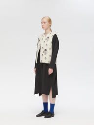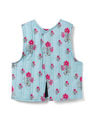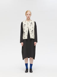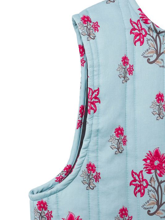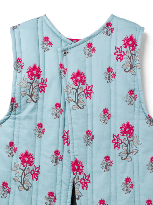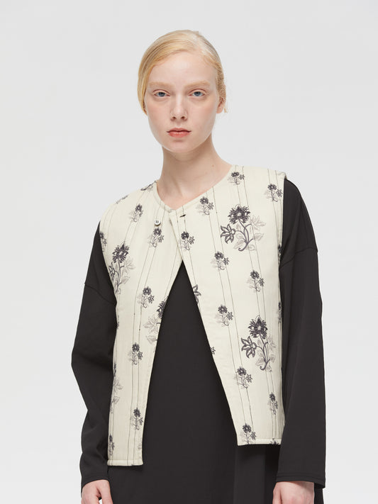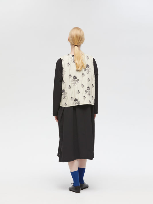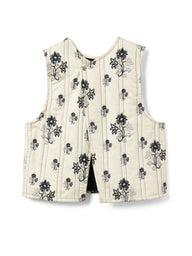 インドメイドならではの風合いが魅力で、エスニックな花柄が印象的なキルティングベストです。前後どちらでも着られる2WAY仕様で、スタイリングの幅が広がります。ボリュームのあるキルティングでも、ほどよくショート丈に仕上げているためジャストなシルエットでボトムスを選ばずバランスよく着こなしていただけます。ワイドなトップスやシャツにも重ねやすく、羽織るだけで印象的なコーディネートを演出します。しっかりとしたコットン素材で温かく、軽やかに着られるため、秋冬のレイヤードスタイルにも最適。同素材でジャケット(3-230090 / print quitting JK)も展開。