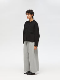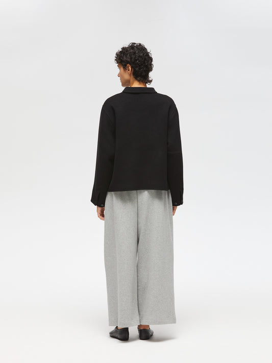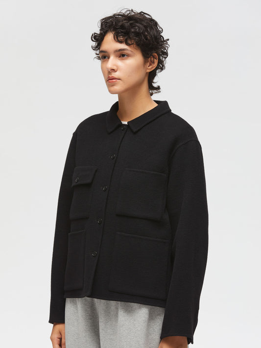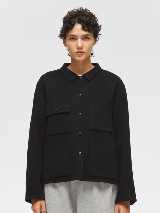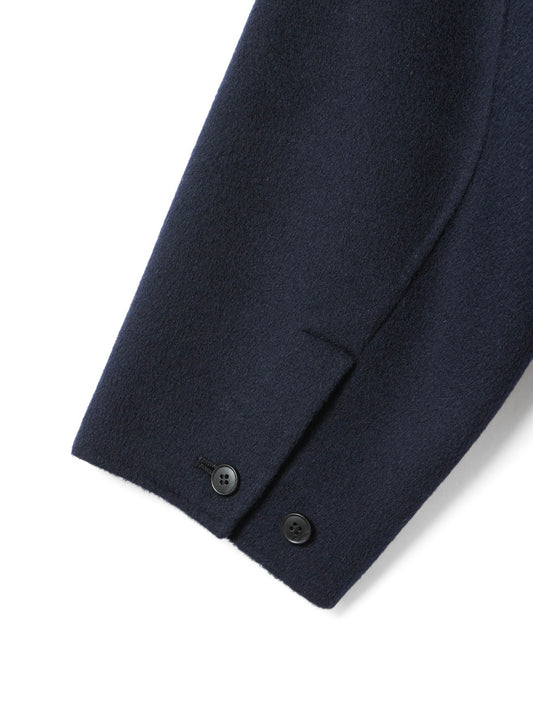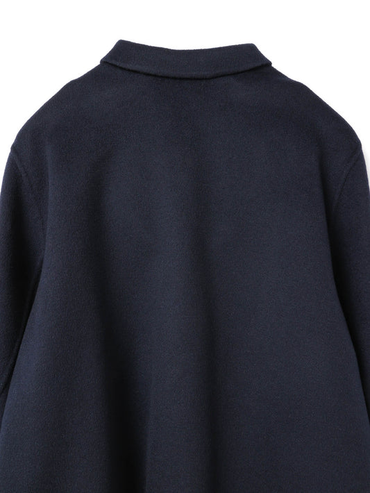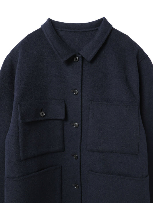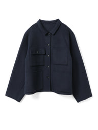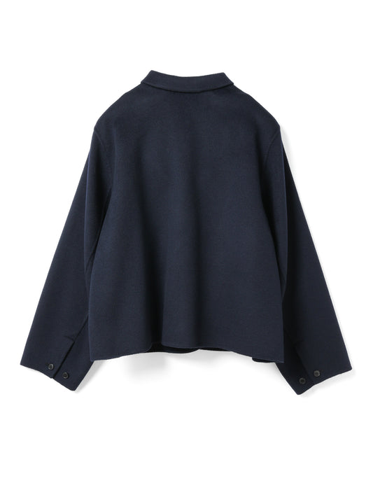 ワーク風のカバーオールをベースに仕立てたジャケットです。小ぶりで上品な襟元と、フロントに配したポケットがアクセントとなり、ミニマルながらも存在感のあるデザインに仕上がっています。袖口には2つのボタンを備え、シーンやスタイリングに合わせて調整可能。ほどよくショート丈のバランスはボトムス問わず合わせやすくコーディネートで活躍します。身幅には程よいゆとりを持たせているため、ニットやシャツを重ねてもすっきりと着こなせます。仕立ては、一針一針を丁寧に縫い合わせた手間暇のかかるリバー仕様。裏地のない一枚仕立て、ウール100%で軽さと温かさを兼ね備えており、秋冬のアウターとして頼もしい一着です。なめらかな質感と上品な風合いの素材が、シンプルなデザインに品格を添え、カジュアルスタイルにもきちんと感を演出してくれます。同素材でテーラードジャケット(3-270062 / wool tailored JK)も展開。