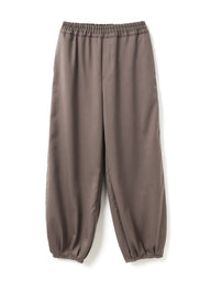 トラッドとスポーティをミックスしたデザインパンツ。股下を長めに取り、裾をタックで絞ることで独特な動きのあるシルエットを演出します。スポーティな雰囲気を持ちながら、トラッドな印象で幅広いスタイリングに対応。長め設計でシューズにワンクッション置くスタイルで、こなれた着こなしを楽しめます。ウエストはゴム仕様に加え内側にドロストコードを備え、サイズを自在に調整可能。フロントはフェイクデザインで、トップスをインしてもすっきりと見えます。ウールライクな合繊素材を使用。落ち感のある生地がゆったりとしたシルエットを引き立てます。裏地なし、両サイドにポケット付き。サイドポケット付き。