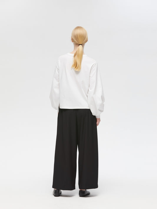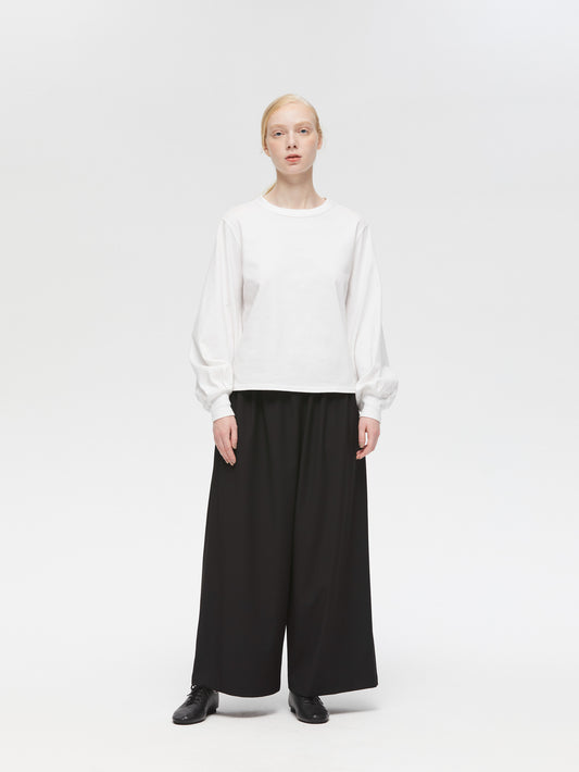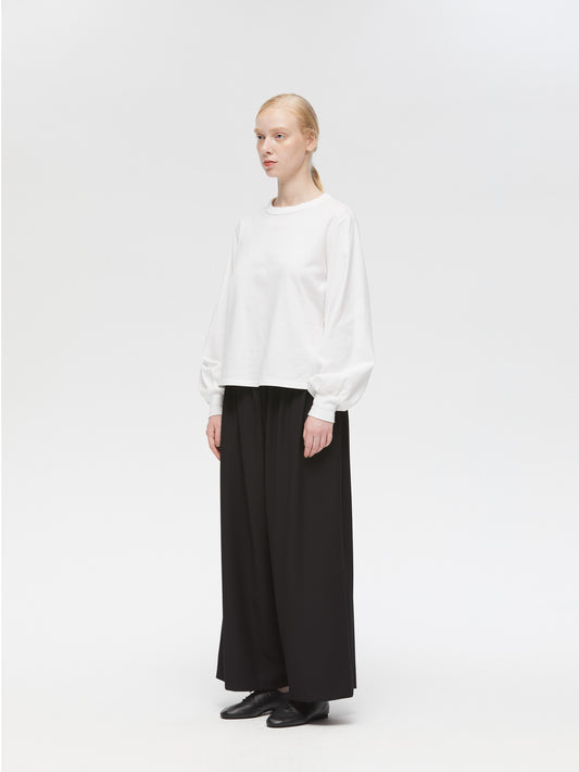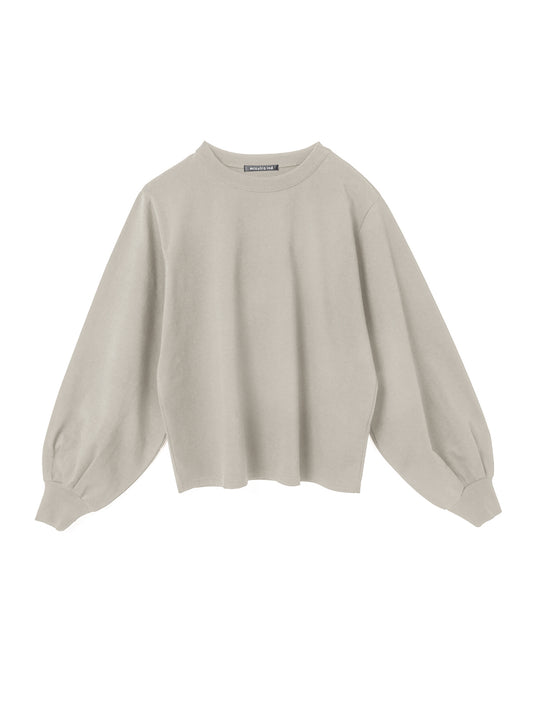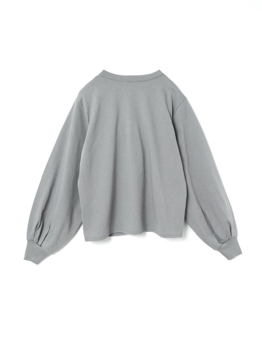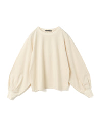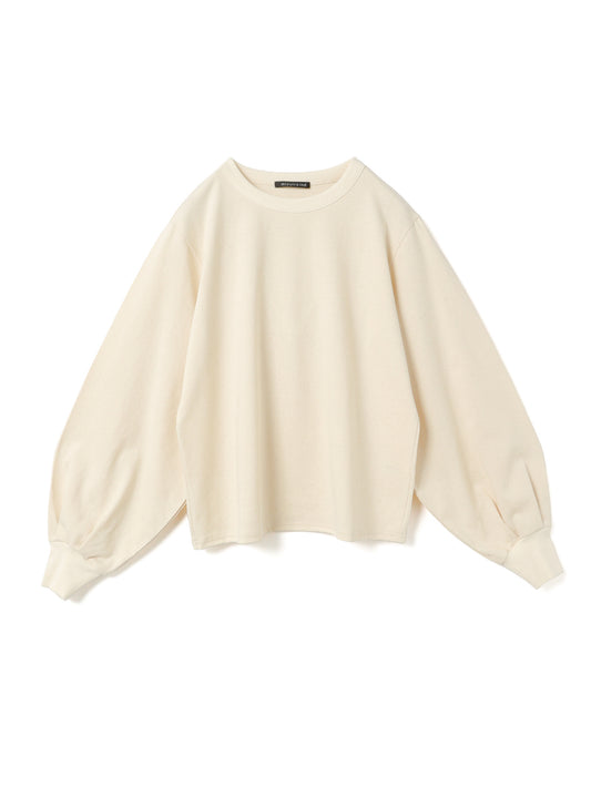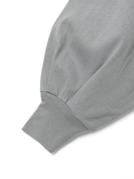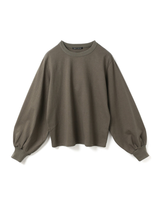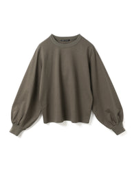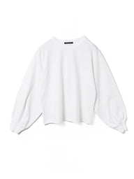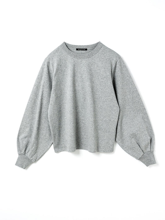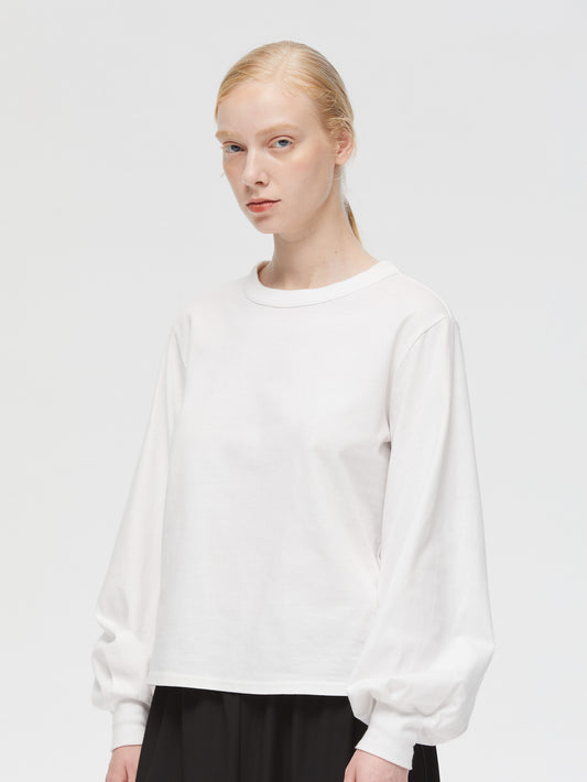 メンズライクなドライタッチコットンを使用した女性らしいパフスリーブがポイントの長袖Tシャツ。コンパクトな身頃とパフスリーブのボリュームがアクセント。アームホールを狭めた設計でベストなどレイヤードアイテムとしても重宝します。環境に配慮した加工法を用いたブリングアウトエコ仕様。ドライタッチで爽やかな着心地。淡色は多少の透け感がございます。アイボリーは生成り素材で黒い点が入る自然な風合いを生かした生地となっています。