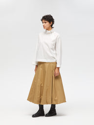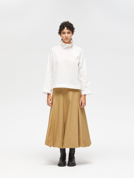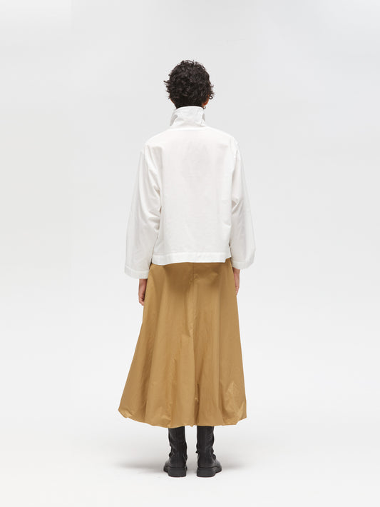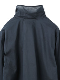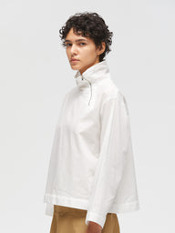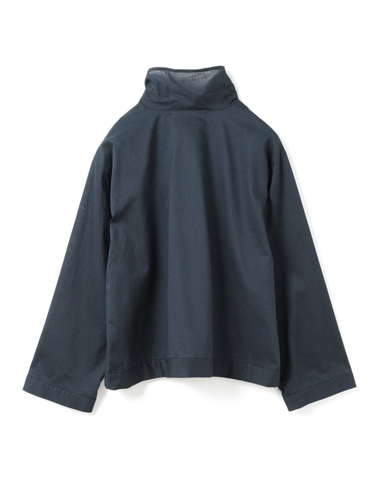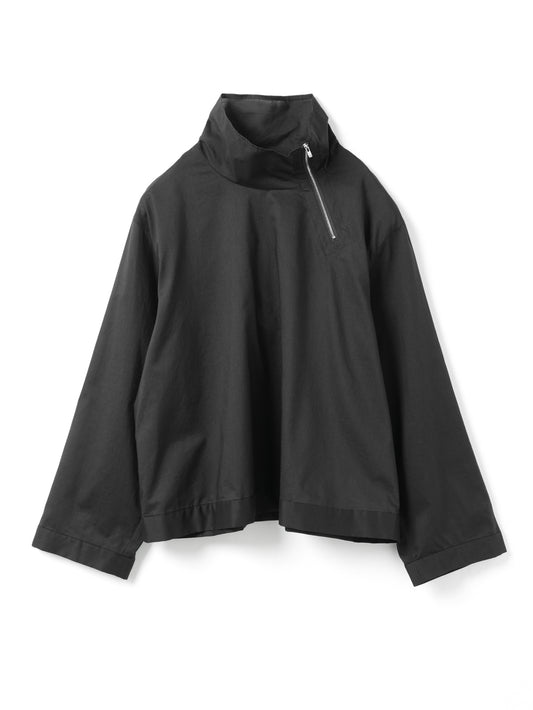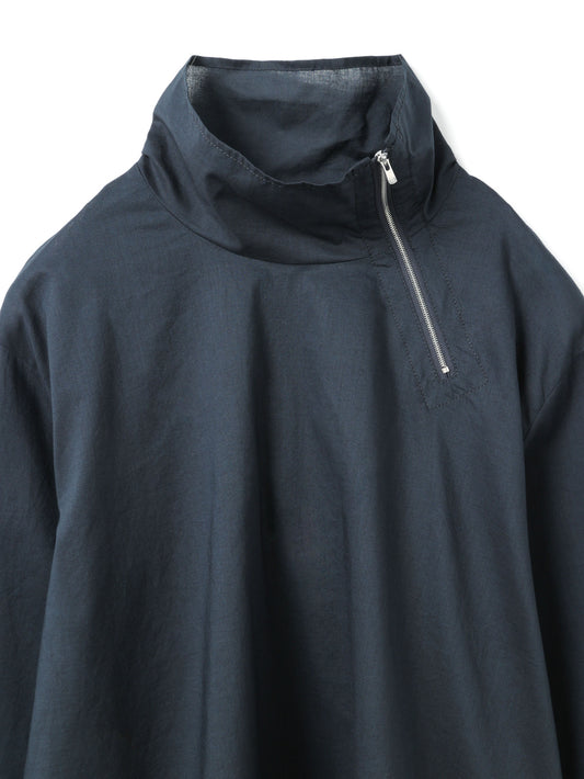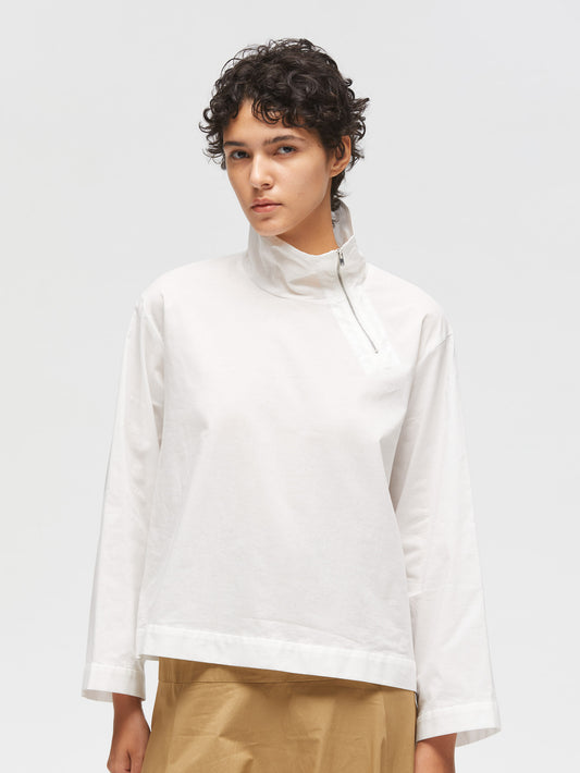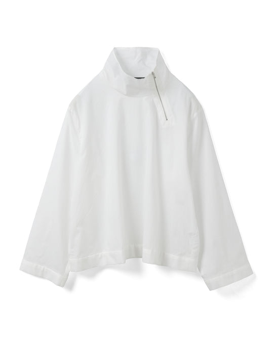 ブラウスにスポーティーなエッセンスをプラス。ハイネックのZIPデザインが印象的な一枚。滑らかで滑りの良いエクセラジップを使用し、開閉もスムーズ。ジップを閉めてハイネックに、開けて襟のように、と表情を変えて着用いただけます。身幅と袖にゆとりを持たせたワイドシルエットで、リラックス感のある着心地。やや短めの着丈で、ボトムスを選ばずバランスよく決まります。素材は薄く軽やかな60ローンコットンを使用。通気性が高く、暑い季節からロングシーズンまで活躍します。