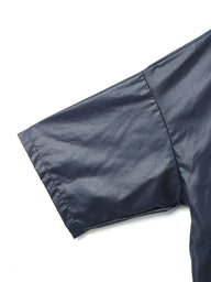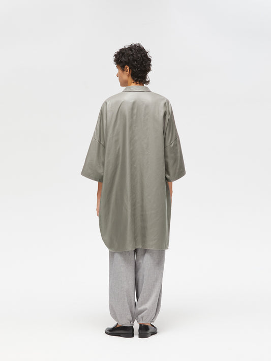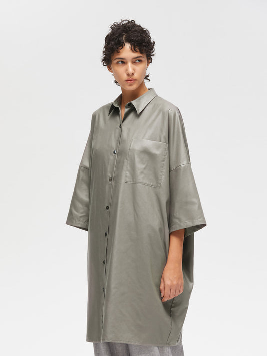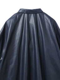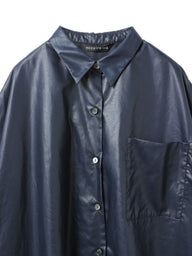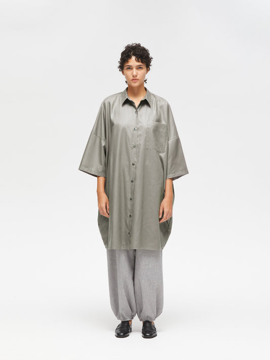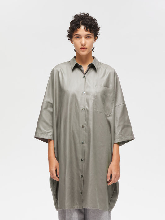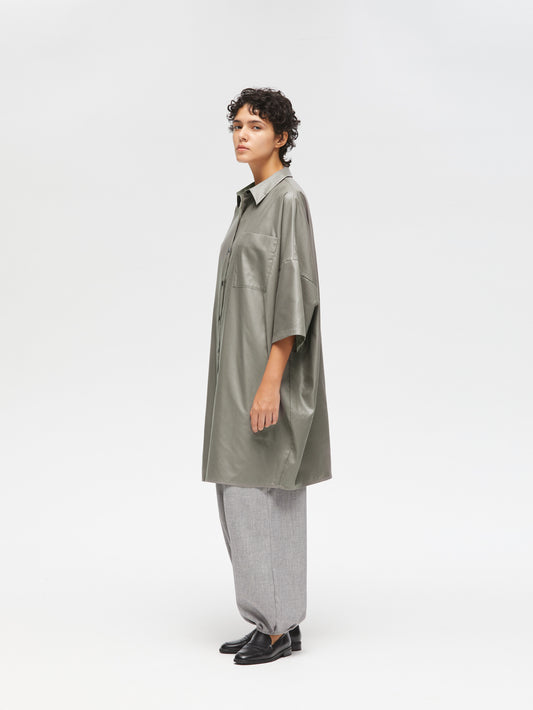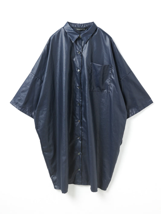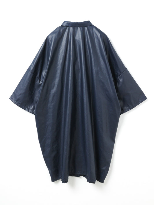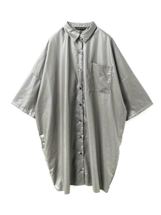 ワックスオイルを丁寧に塗り込んだオイルドコットンのような、落ち着いた光沢感と上品な風合いが魅力のシャツワンピースです。ワイドでゆったりとした落ち感のあるシルエットがスタイルを引き立て、前を開けて羽織りとしても活躍します。大きめの胸ポケットがアクセントになり、すっきりとしたレギュラーカラーでミニマルに仕上げました。袖丈はやや短めでレイヤードスタイルも楽しめます。軽やかな合成繊維素材で扱いやすく、オールシーズン着用可能です。サイドポケットはございません。同素材でパンツ( 3-260078 / glossy drawstring hem easy PT)も展開。