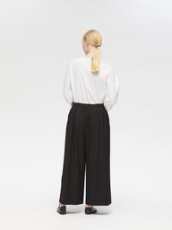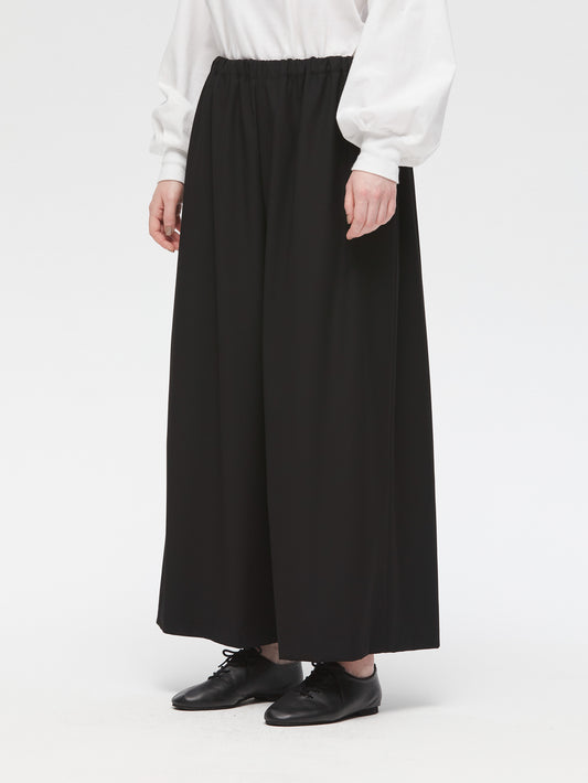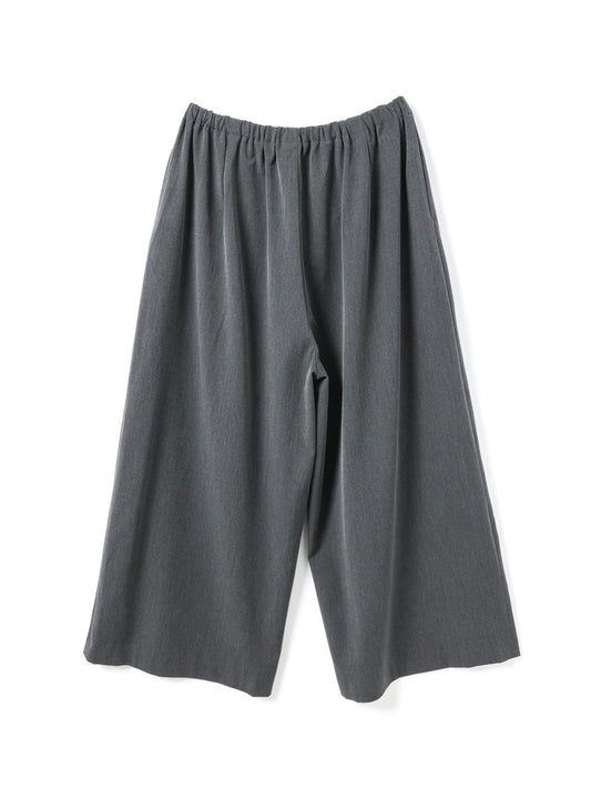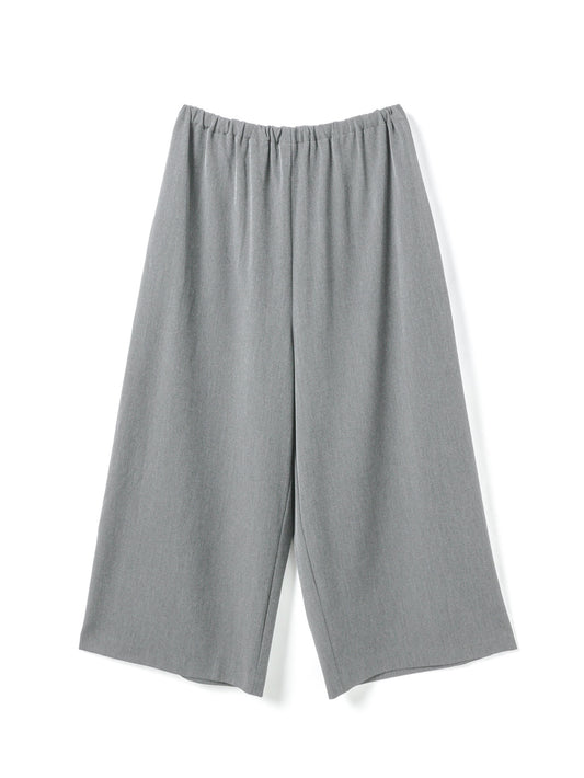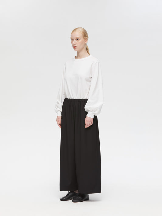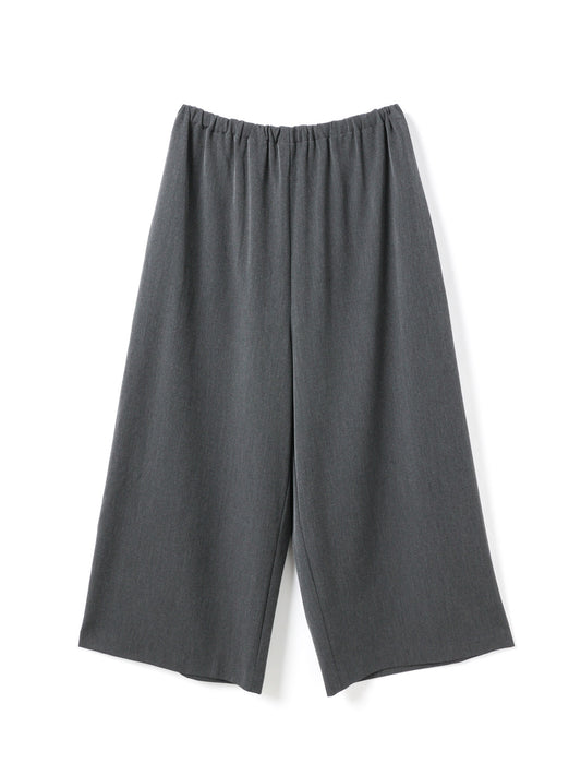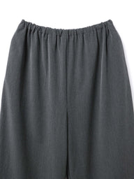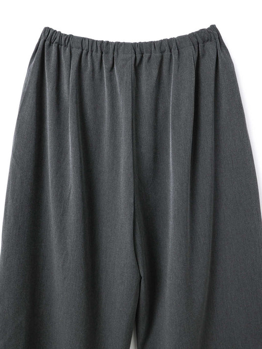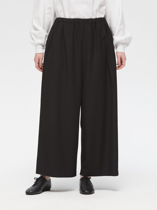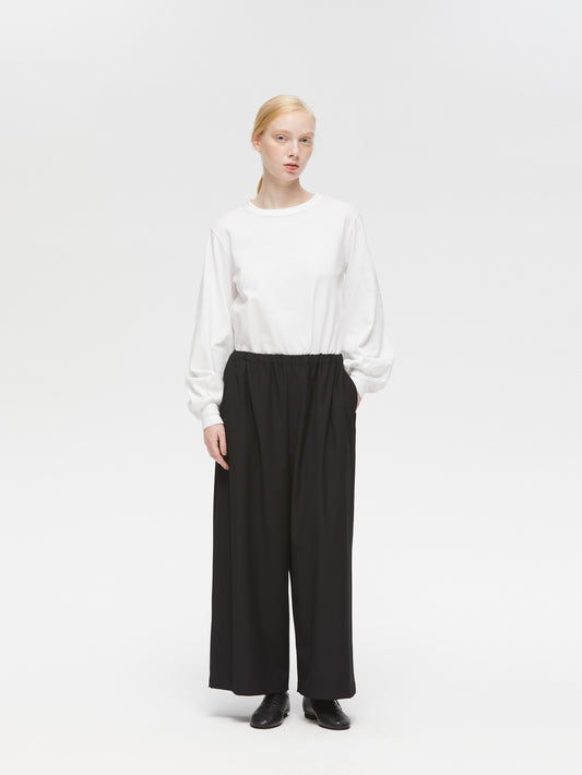 落ち感の美しいワイドイージーパンツ。タックとギャザーで腰回りをすっきり見せ、程よくワイドなストレートシルエットがトップスを選ばず活躍します。ウエストはゴムとドロストコードで調節可能、細めのベルト幅でトップスインも映えるデザイン。ウールライクな合繊素材で4WAYストレッチ仕様。動きやすくシワになりにくく、快適な着心地です。サイドポケット付き。裏地なし。同素材のシャツ(3-230096 / T/R basic shirts)とのセットアップもおすすめです。