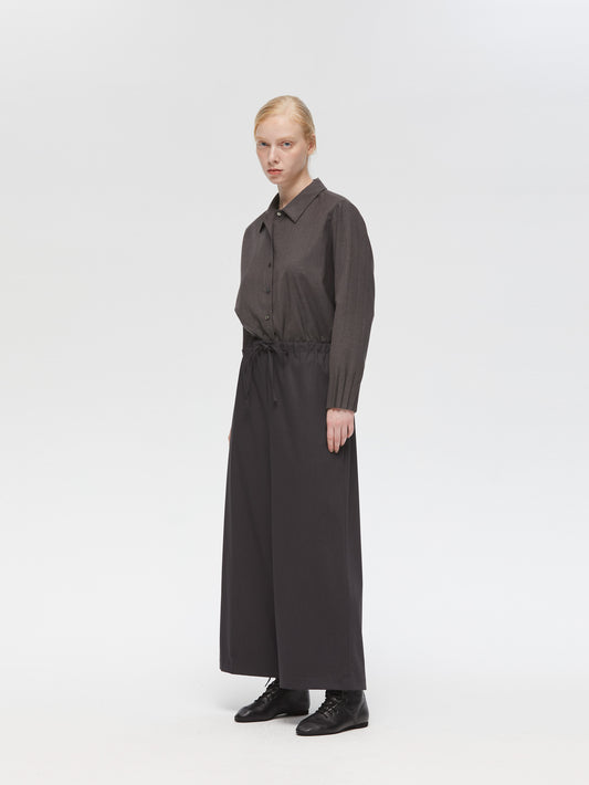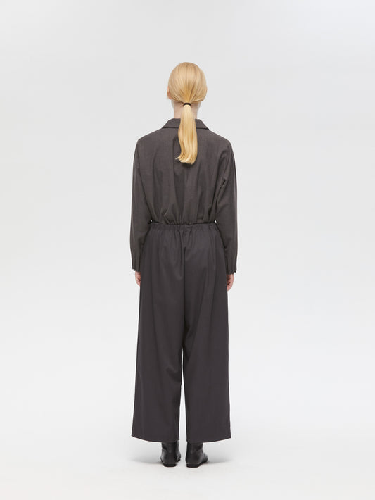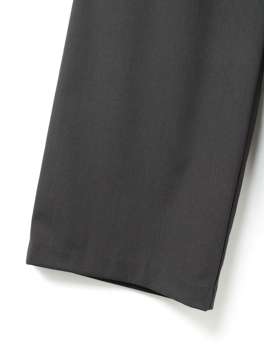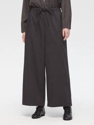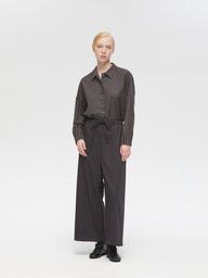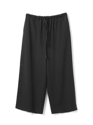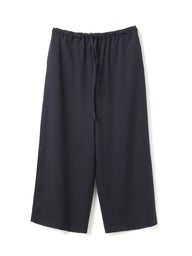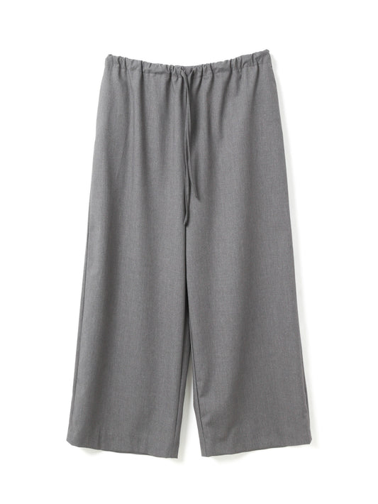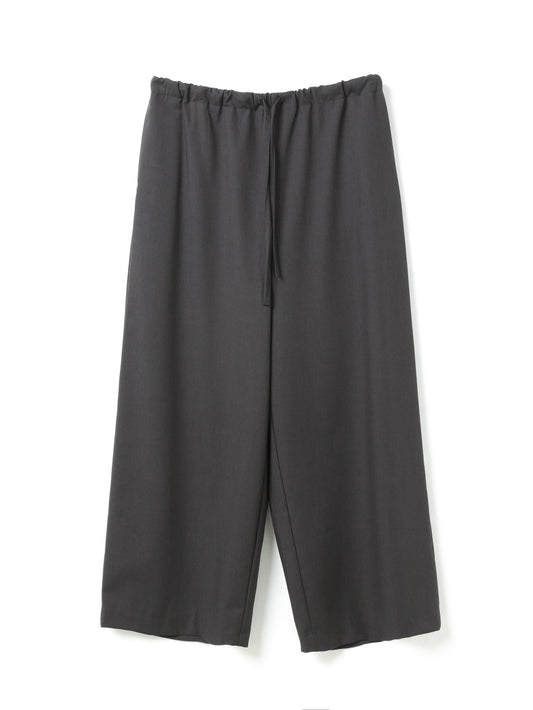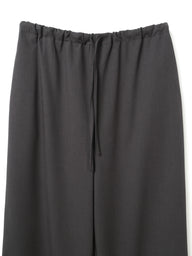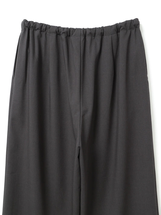 スラックスのようなすっきりとしたデザインで、フルレングスのストレートなシルエットが印象的なパンツです。ワイドなラインながらも落ち感があり、リラックスしたイージースタイルで着用いただけます。ウエストはゴムとドロストコードで調整できる仕様で、シンプルなデザインが全体をすっきりと見せ、どんなトップスとも自然に馴染みます。ベーシックながら存在感のある一着で、デイリーからきちんと見せたいシーンまで幅広く活躍。合わせるアイテム次第で、きちんと感のあるスタイルにもカジュアルな着こなしにも対応でき、長く愛用いただけます。サイドポケット付き。裏地なし。同素材のジャケット(3-230087 / double breasted shit JK)とセットアップもおすすめ。