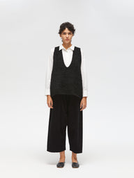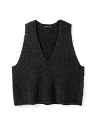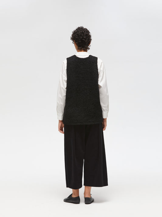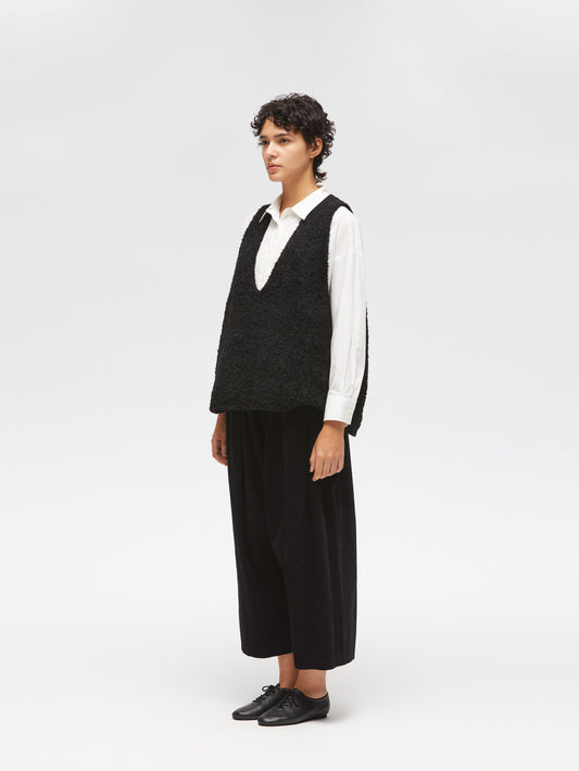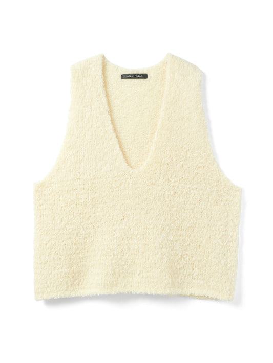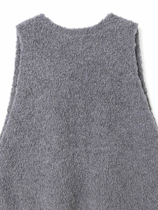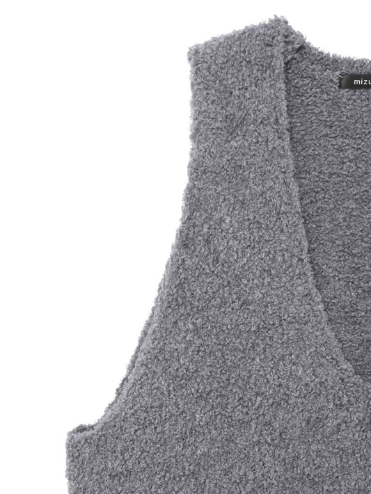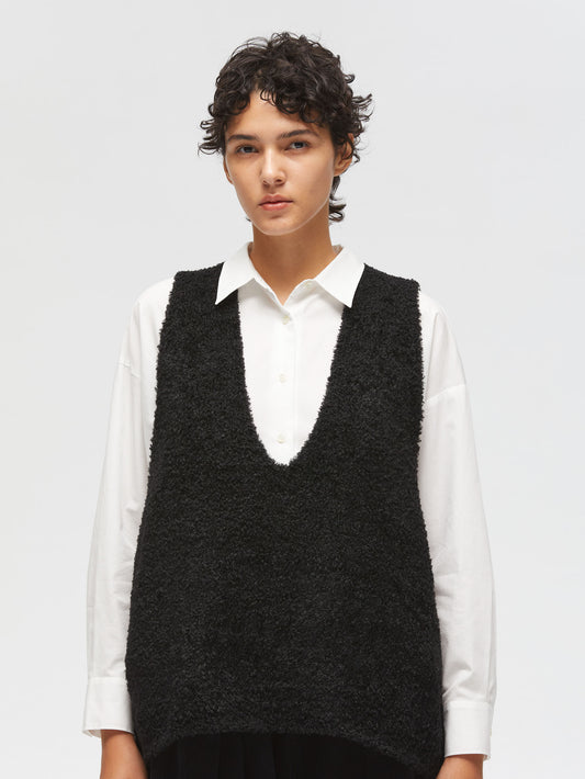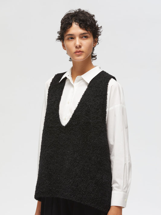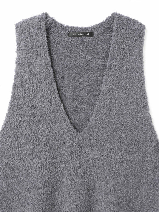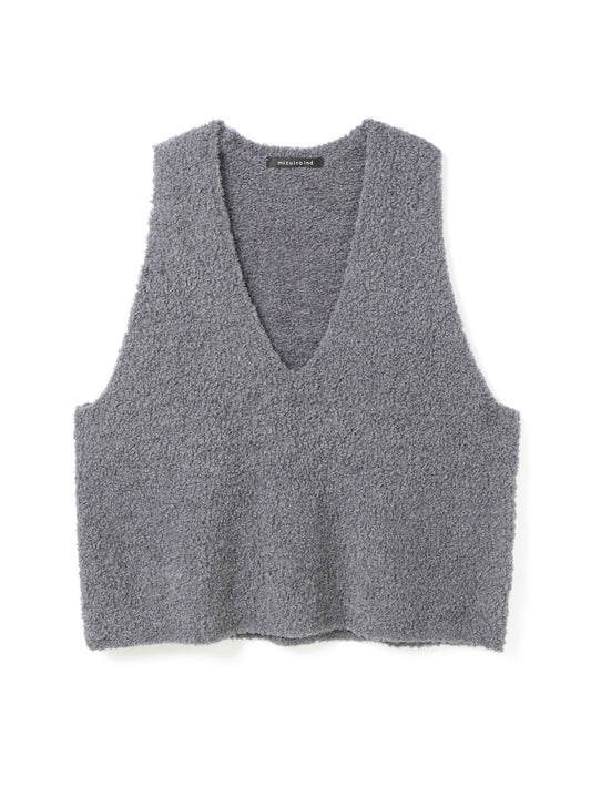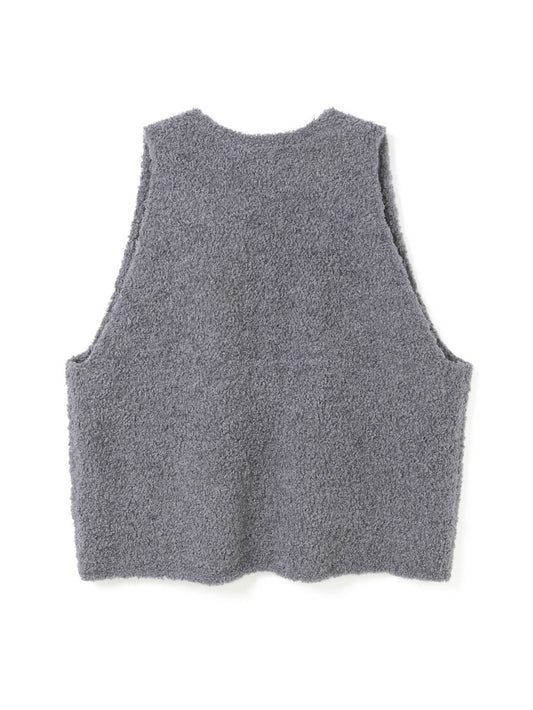 人気のへアリーVネックベストが今季も登場。昨年よりも少しコンパクトなシルエットに変更バランスよく着こなせるシルエットにアップデートしました。ループ編みのもこもことした素材感で寒い季節を温かく彩るへアリーヤーンのワイドベストです。丸みのある深Vネックがポイント。アームホールを広めに設計しアイテム問わず合わせやすくコーディネートで活躍します。リサイクルポリエステルのモール糸を使用したループヤーン。とても柔らかでふかふかの素材感。