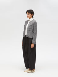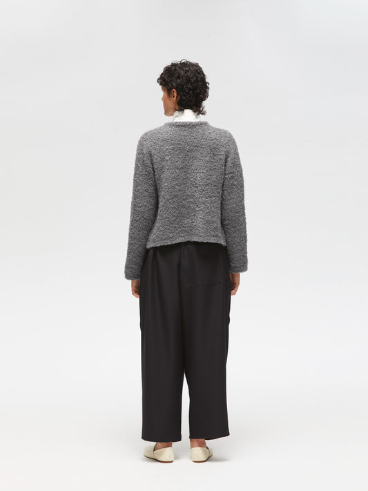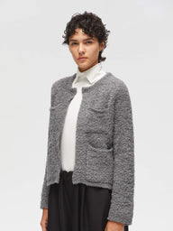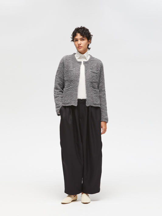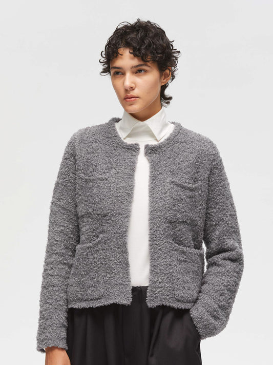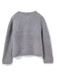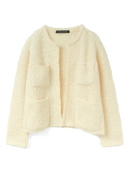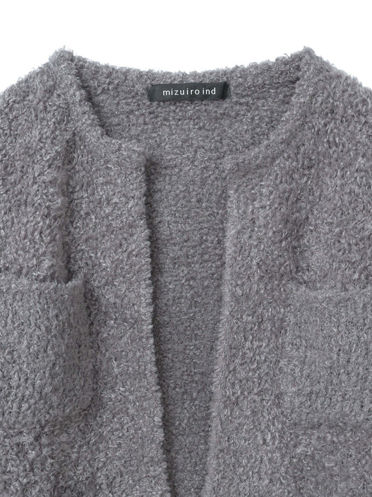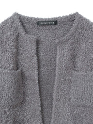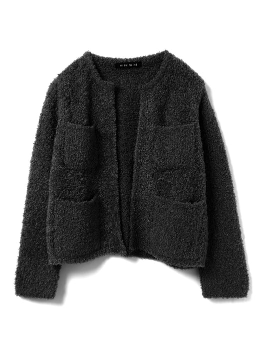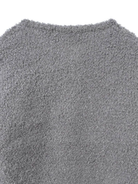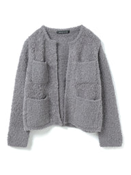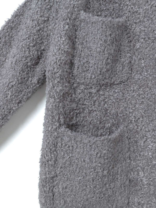 人気のヘアリーシリーズから、新作カーディガンが登場。リサイクルポリエステルを使用したモール糸のループヤーンで編み立て、ふかふかと柔らかく温かみのある風合いに仕上げました。ヴィンテージの上品なジャケットをベースにしたデザインで、フロントのポケットがアクセント。ショート丈ならではのバランスのとりやすさと、もこもことした程よいボリューム感が魅力です。羽織るだけで存在感があり、シンプルなインナーに合わせてもこなれた印象を演出。寒い季節のスタイリングをやさしく包み込みながら、温かく彩る一着です。同素材でベスト(3-220095 / hairly V neck vest)も展開。