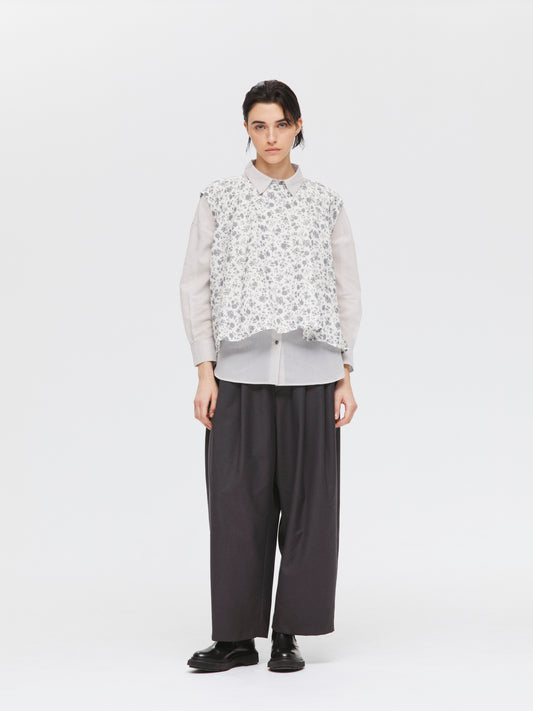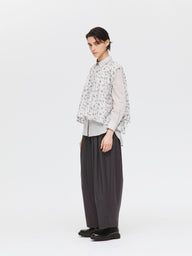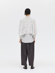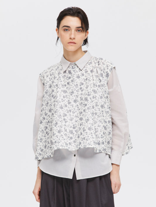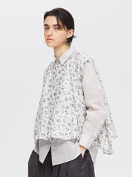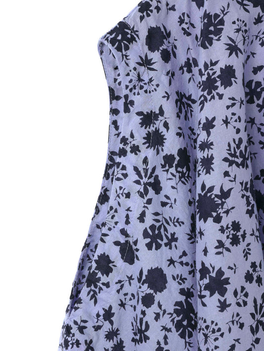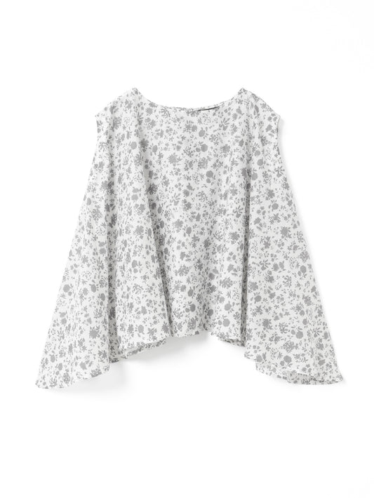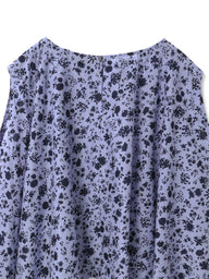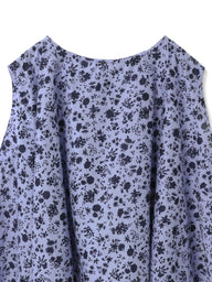 落ち着いたモノトーンの小花柄が印象的なノースリーブフレアプルオーバーです。横に広く用尺を取り、ふんわりと広がるフレアシルエットが魅力。バックネックにはボタンを配しスムーズに着脱できる仕様に。ショート丈でアームホールはジャストなサイズ感。フィット感のあるインナーと合わせたり、夏はタンクトップと一枚でさらりと着こなすのもおすすめです。フレンチスリーブデザインがさりげなく肩を包み体のラインを拾いすぎないのも嬉しいポイント。洗いざらしが似合うナチュラルな80コットンローン素材。優しく爽やかなシアー感が特徴です。同素材でシャツワンピース(1-250070/small flower print gather shirt OP)とVネックシャツ(1-230118/small flower print V neck shirt)も展開。