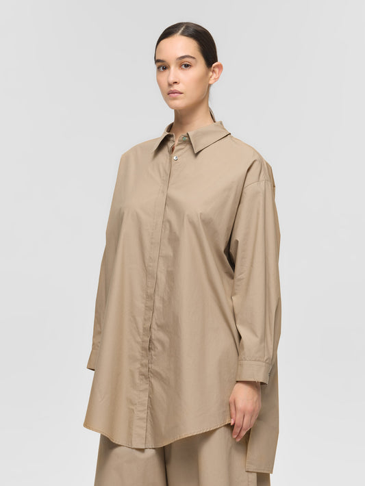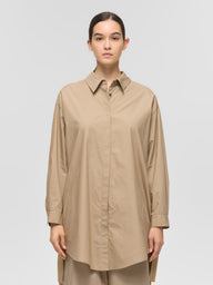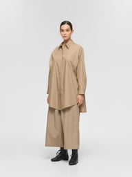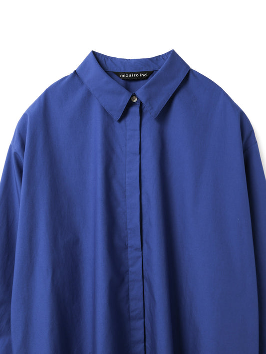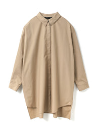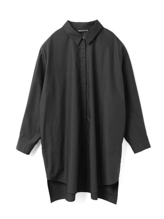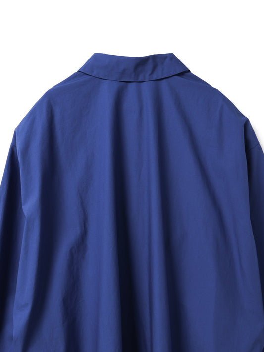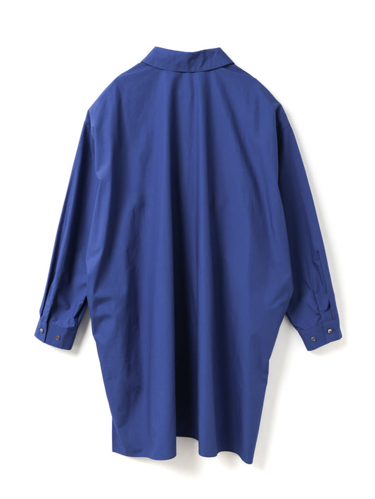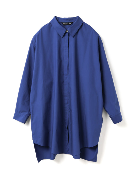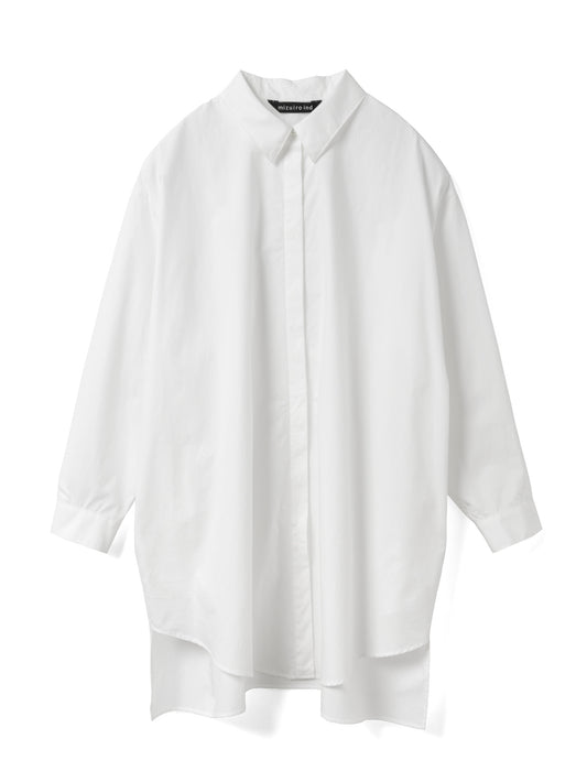 ゆったりとしたシルエットで、シャツとしてはもちろん、軽い羽織りとしてジャケットライクにも着用できる一枚。フロントは比翼仕立てにすることで、すっきりとした印象に仕上げています。ビッグシルエットながら、袖口にタックを施すことで全体をシャープに見せるデザインもポイント。前後差のあるラウンドヘムにはスリットを入れ、ボトムスと重ねた際に動きのあるスタイリングを演出。高密度でハリのある40タイプライター生地を使用し、上品さと実用性を兼ね備えました。両サイドにはさりげなくポケットを配し、デザイン性と利便性を両立。きれいめからカジュアルまで、幅広いスタイリングに活躍します。オフホワイトは多少の透け感がございます。同素材のパンツ(1-260088 / wide half PT)とのセットアップもおすすめです。