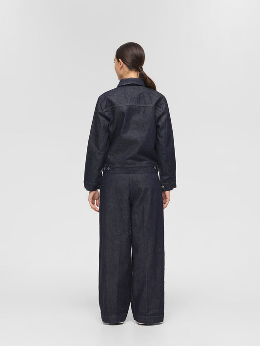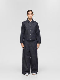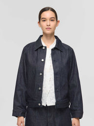 ミニマルでモードなスタイルを意識してデザインしたデニムジャケットです。無駄を省いたすっきりとした表情が、洗練された印象を演出します。生地には岡山製の13オンスデニムを使用し、程よい厚みとハリ感がありながらも着用しやすい仕上がりに。デイリーからきれいめなスタイリングまで幅広く活躍する一着です。同素材のパンツ(1-260087OW / wide denim slacks)とセットアップもおすすめです。