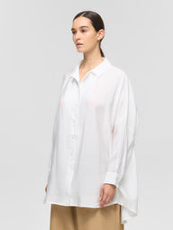 モダール混素材を使用した、柔らかく肌になじむ着心地が魅力の一枚です。ほのかな光沢感があり、しなやかで落ち感のある表情が上品な印象を与えます。シルエットはメンズライクなビッグシルエットを採用し、リラックス感がありながらも洗練された雰囲気に。ラフに着こなすだけでこなれたスタイリングが完成し、デイリーからモードな着こなしまで幅広く活躍します。