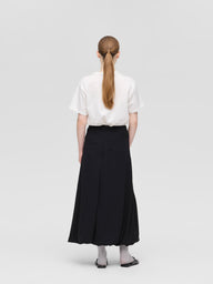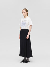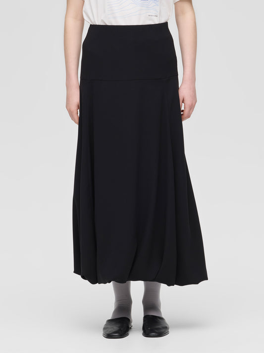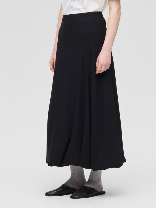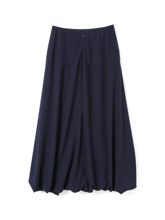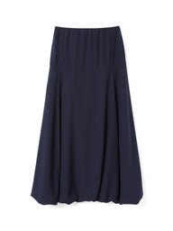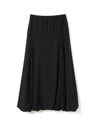 とろみのある上質なジョーゼット素材を使用した、ややひねりを加えたデザインが印象的なバルーンロングスカート。軽やかで落ち感のある生地が立体的なフォルムをやわらかく描き、動くたびに揺れるドレープが上品で軽やかな表情を生み出します。ウエストに心地よくフィットする設計とハイウエスト仕様で、自然なスタイルアップも実現。裏ゴム仕様と後ろファスナーで着脱もスムーズです。きれいめにもカジュアルにも合わせやすく、トップスインやセットアップ風の着こなしもおすすめ。日常からちょっとした外出まで幅広く活躍し、装いにさりげない遊び心と洗練を添えてくれる一着です。同素材のキャミソールベスト(1-230166 / georgette camisole)とセットアップもおすすめです。