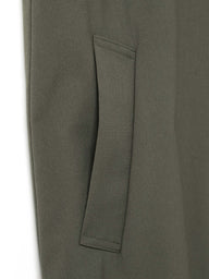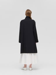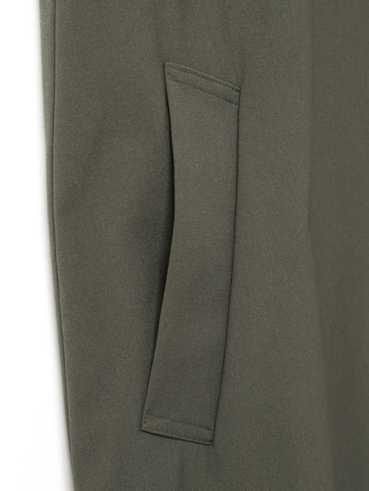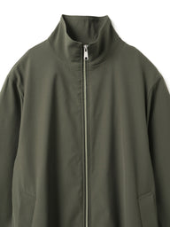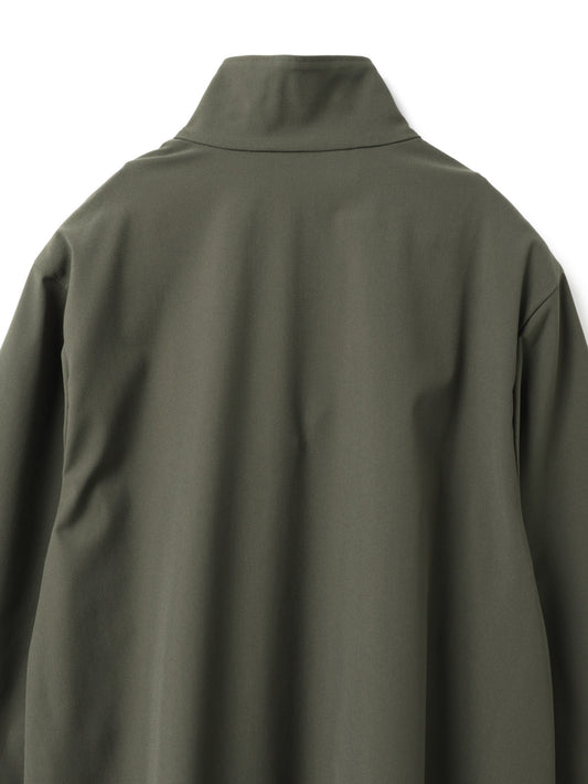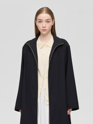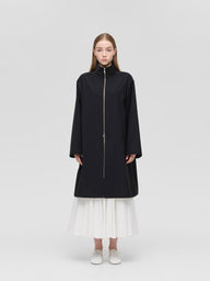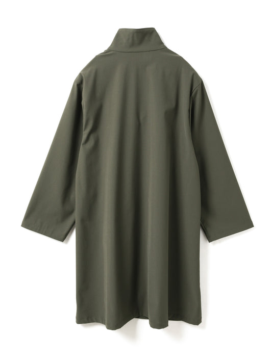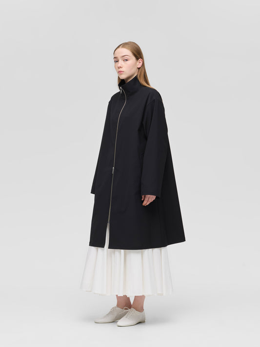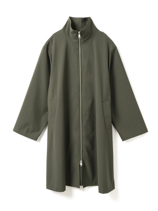 フロントファスナーとすっきりとしたハイネックがスタイリッシュな印象のライトコート。裾に向かって広がるAラインシルエットが女性らしい柔らかさを添え、ミニマルなデザインの中にかっこよさと上品さを兼ね備えた一枚です。程よい落ち感のあるリラックスシルエットながら、ミニマルなデザインがモードで洗練された雰囲気を演出。さらっと羽織れる軽やかさも魅力です。素材にはしなやかでさらりとしたタッチのソロテックストレッチ生地を使用。とろみのある質感とほのかなシャリ感が心地よく、シワになりにくく使いやすい1枚。フロントはWジップ仕様で、開け方のアレンジによってさまざまな着こなしが楽しめます。サイドポケット付き。