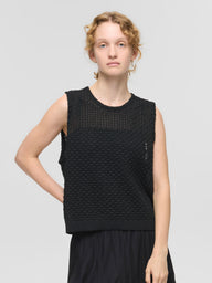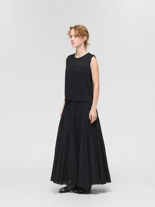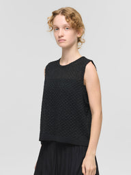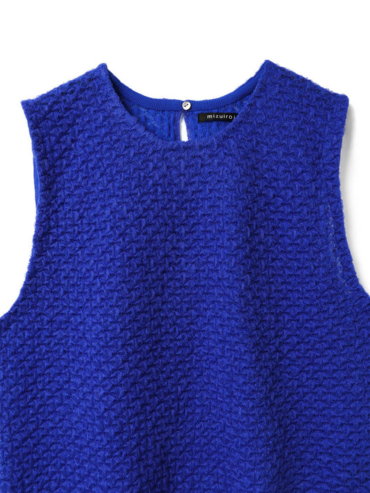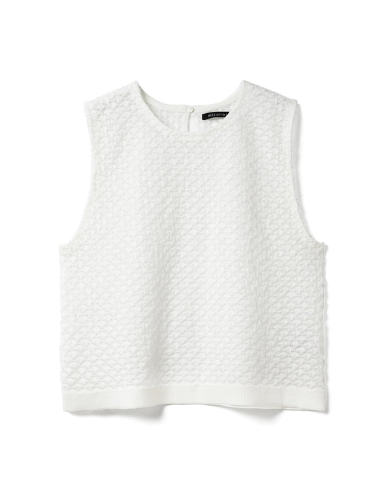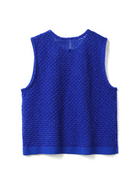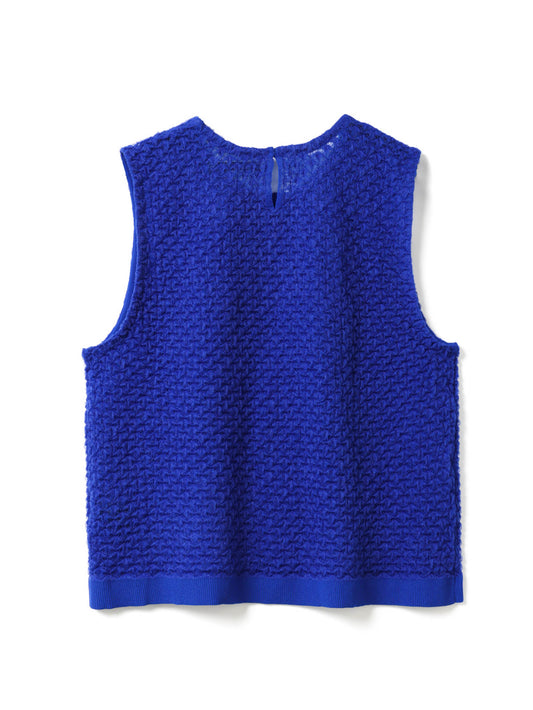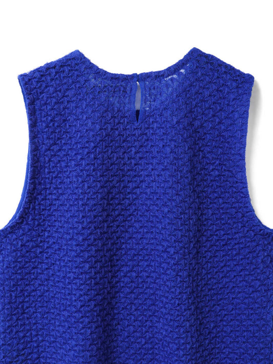 立体的なハイゲージの柄編みが目を引く、シアーニットベストです。ヴィンテージアイテムを思わせる、チュールのように繊細で軽やかな素材感が印象的。無駄を省いたミニマルなデザインとジャストなシルエットで、すっきりと上品に着こなしていただけます。背面はボタン仕様となっており、着脱しやすいのも嬉しいポイント。ポリエステルの合繊素材を使用したシアーニットは、程よい透け感と優れた伸縮性があり、重ね着でもストレスフリーな着心地です。カットソーやシャツ、ワンピースなど幅広いアイテムと合わせやすく、季節を問わずオールシーズン活躍する一枚です。同素材でハーフスリーブワイドプルオーバー(1-220058 / patterned sheer wide P/O)も展開しています。