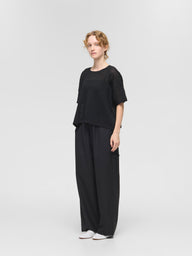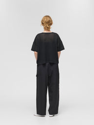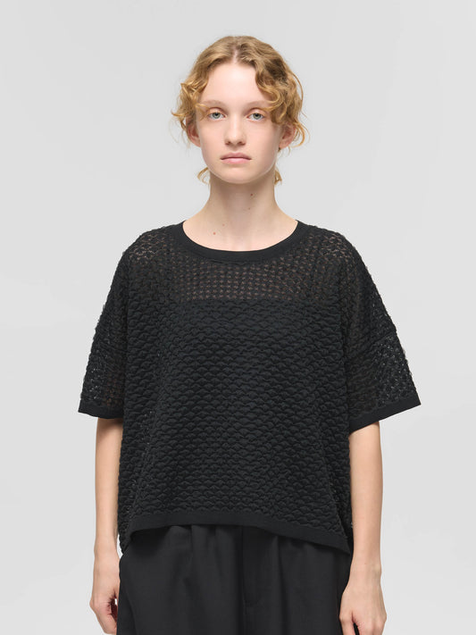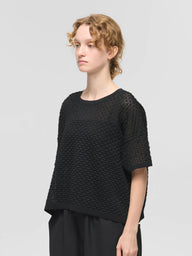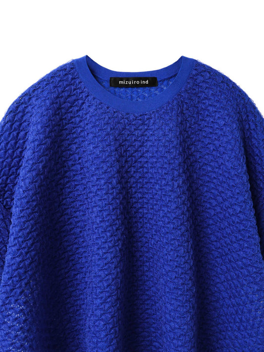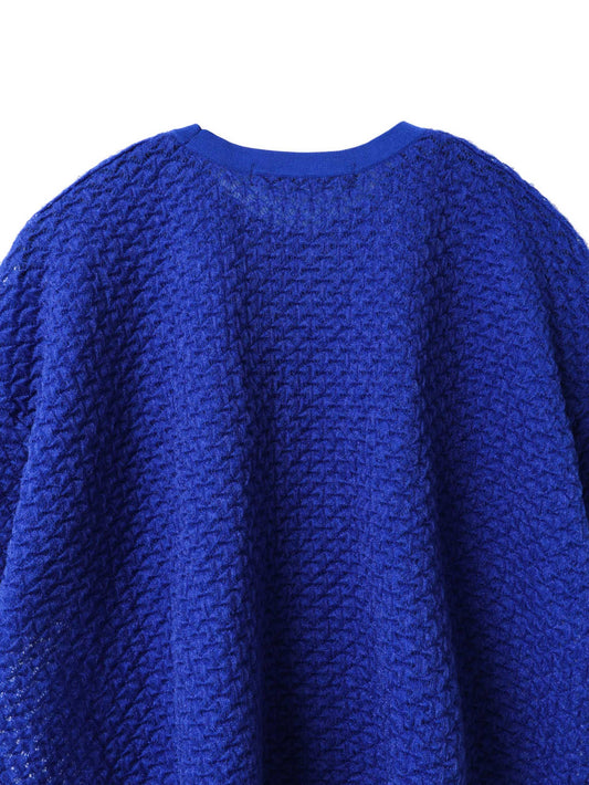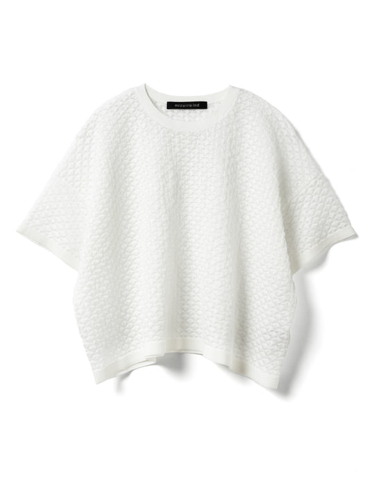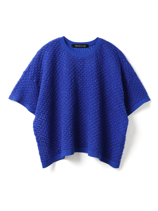 立体的なハイゲージの柄編みが目を引く、シアーニットのワイドプルオーバーです。ヴィンテージアイテムを思わせる、チュールのように繊細で軽やかな素材感が印象的。無駄を省いたミニマルなデザインに、身巾をたっぷりと取ったワイドシルエットで、自然な落ち感のある表情に仕上げています。程よくショートな丈感のため、ワイドボトムスやスカートともバランス良く合わせていただけます。ハーフスリーブ仕様で、ベスト感覚のレイヤードスタイルもおすすめ。ポリエステルの合繊素材を使用したシアーニットは、程よい透け感と優れた伸縮性で重ね着でもストレスフリーな着心地です。カットソーやシャツ、ワンピースなど幅広いアイテムと合わせやすく、季節を問わずオールシーズン活躍する一枚です。同素材でベスト(1-220057 / patterned sheer vest)も展開しています。
