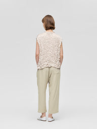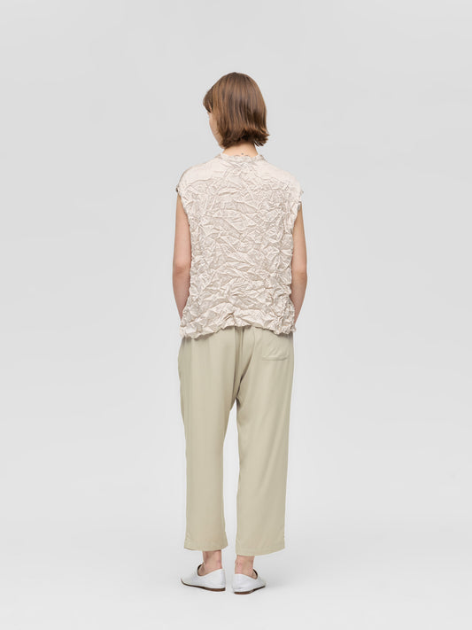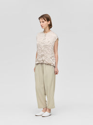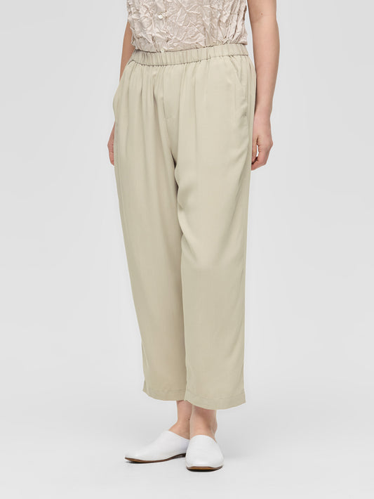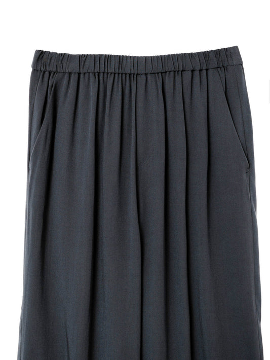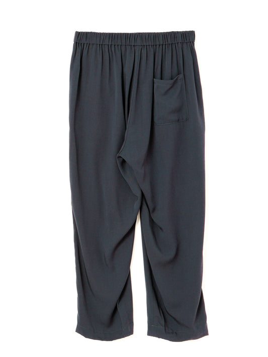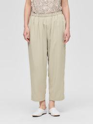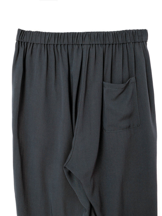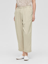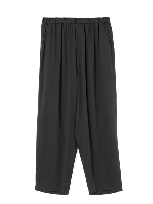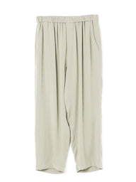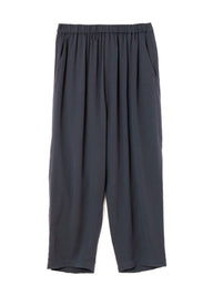 mizuiro indの定番として人気のパンツ。シワになりにくいレーヨン素材を使用し、しなやかに落ちる美しいドレープと、なめらかでスムースな肌触りが魅力です。ウエストは総ゴム仕様で、締め付け感がなくリラックスした穿き心地。シンプルながら程よくゆとりのあるシルエットで、体のラインを拾いにくく、上品な印象に仕上がります。足元がすっきり見える8分丈設計で、フラットシューズからヒールまで幅広く好相性。大人の品のあるパンツスタイルを気負わず楽しめる一枚です。サイドポケット付き、裏地なし。