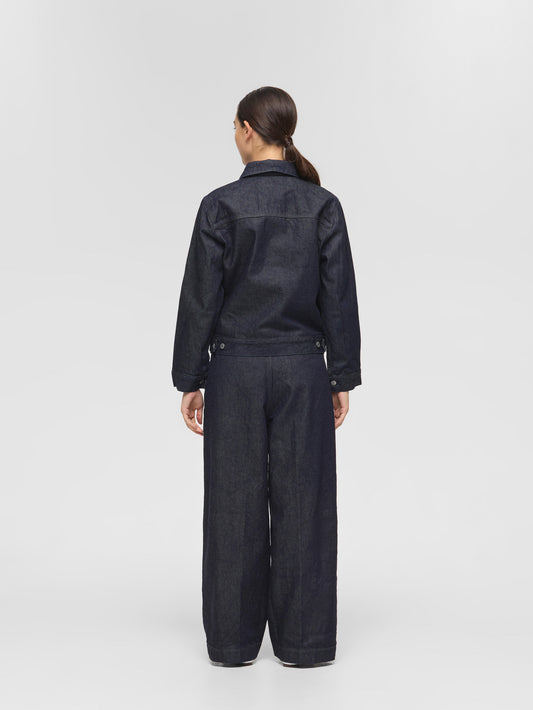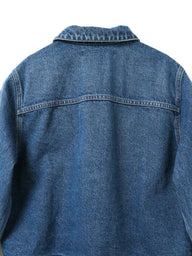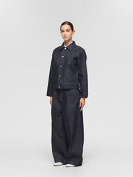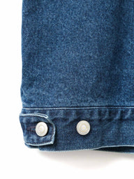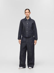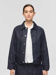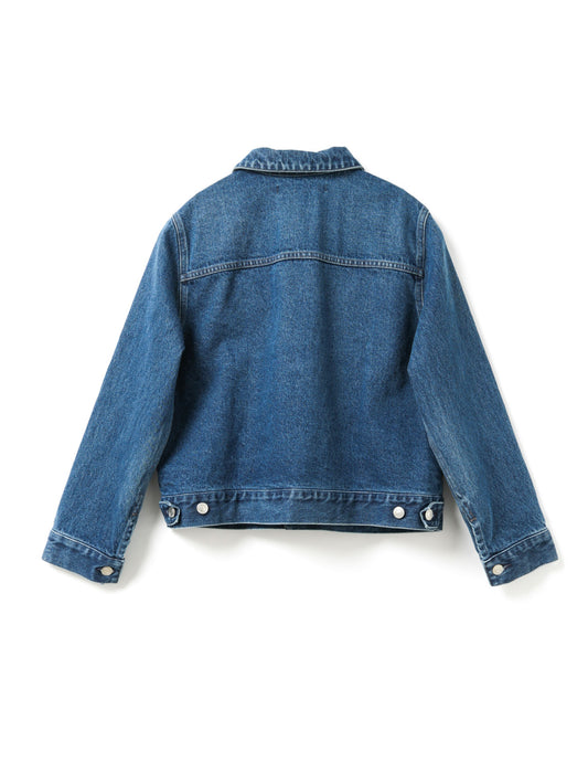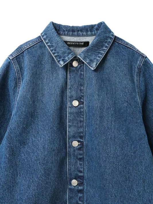 ミニマルでモードなスタイルにデザインしたデニムジャケット。無駄を省いたすっきりとした表情が、落ち着きのある洗練された印象を演出します。小ぶりな衿とショート丈のバランスが特徴で、ボリュームのあるボトムとも合わせやすく、自然とスタイリングが決まる一着です。素材には岡山製の13オンスデニムを使用し、程よい厚みとハリ感を備えながらも、硬すぎず快適な着用感に仕上げました。デイリー使いはもちろん、きれいめなコーディネートにも取り入れやすく、幅広いシーンで活躍します。ボタンにはmizuiro indのロゴを刻印。同素材のパンツ(1-260087DM / wide denim slacks)とのセットアップスタイルもおすすめです。