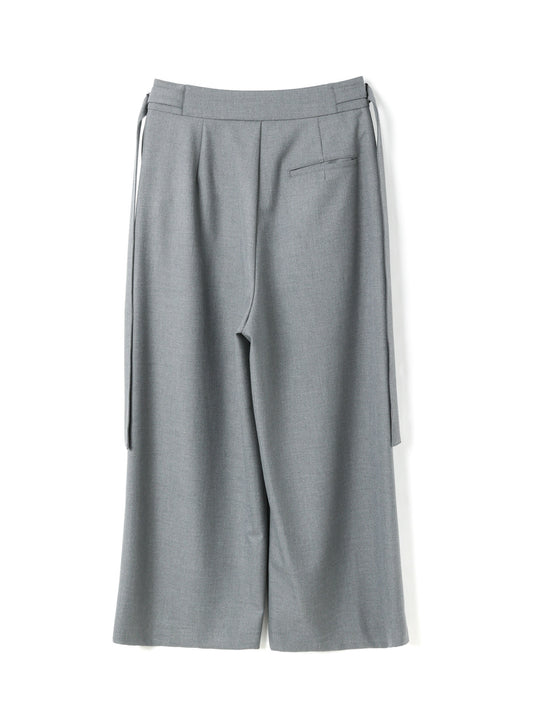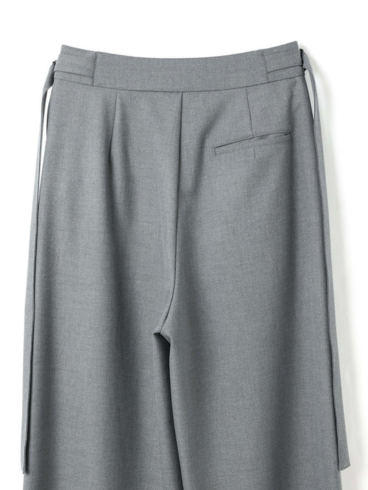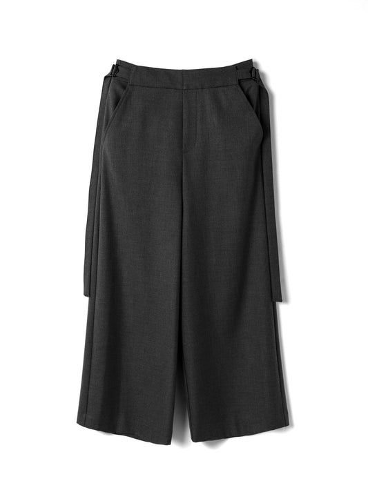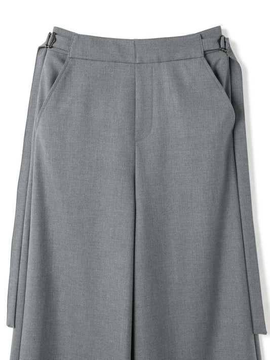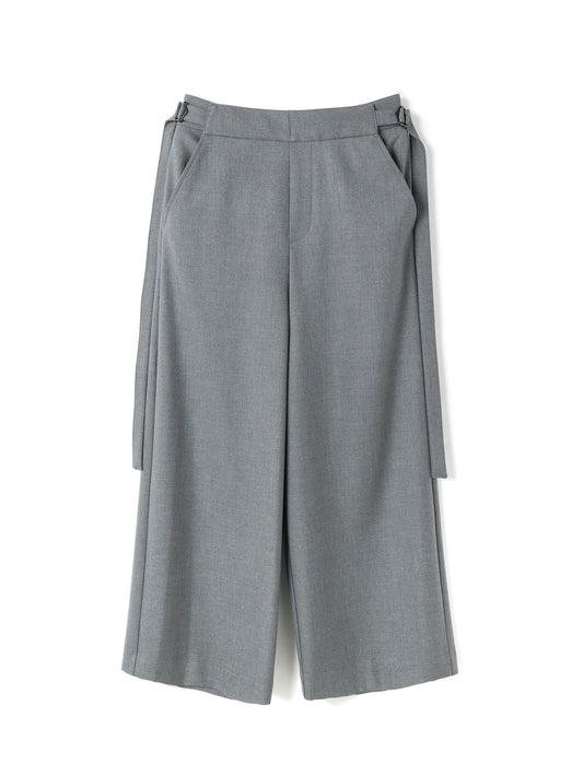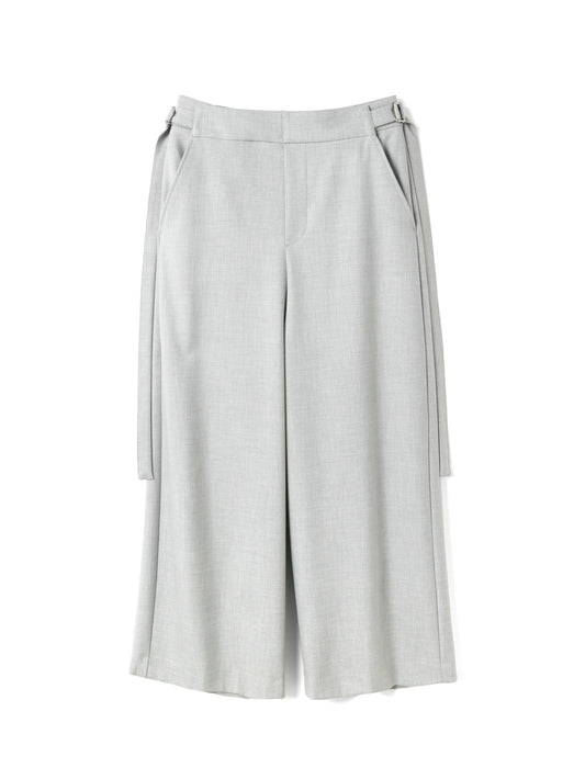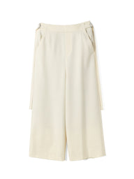 サイドのバックルとベルトがポイントの、マリン風デザインを採用したパンツ。サイドのベルトが垂れて動きのある表情をつくります。ウエストは内側のボタンで留める仕様で、すっきりとしたシルエットに仕上がり、トップスインもきれいに決まる1本です。フルレングスの上品なシルエットに、しっとりとした風合いのきれいなツイル素材を使用。ニットなど異素材とのコーディネートでも映える質感です。伸縮性があり、快適な穿き心地も魅力。サイド・バックポケット付き。