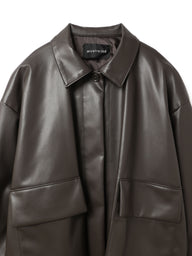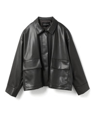 シボ感のあるリアルな表情を持ちながら、柔らかくしなやかな質感のフェイクレザージャケット。ワークジャケットをベースにしつつ、小さめの襟と比翼仕立てのフロントを採用することで、ミニマルで凛とした印象に仕上げています。程よくワイドなシルエットは、アウターとしてもジャケットとしても使いやすく様々なコーディネートで活躍。フラップポケットをアクセントに加え、落ち感のあるドレープシルエットが、存在感のある雰囲気を演出します。リアルレザーさながらの質感と着心地の良さを両立させた、モダンな一枚です。同素材でMA-1ベースのジャケット( 3-270061 / synthetic leather zip blouson)も展開。