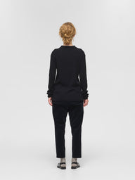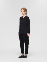長めでシャープな襟がすっきりとした印象を与えるニットプルオーバー。上品なラインを描く襟元は、顔まわりをきれいに見せてくれるだけでなく、コーディネートに洗練されたアクセントを添えてくれます。薄手ながら温かみのあるリブニット素材を使用し、身体にほどよく寄り添う快適なフィット感を叶えました。アウターの中でももたつかず、1枚でもインナーとしても活躍する万能さも魅力です。シンプルでありながらもデザイン性のある一着は、デイリーからきちんと感を出したいシーンまで幅広く対応。スタイリングをさりげなく格上げしてくれる、ワードローブに一枚は持っておきたいアイテムです。同素材でハイネックプルオーバー(4-220090 / rib high neck P/O with button)も展開。