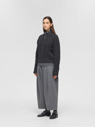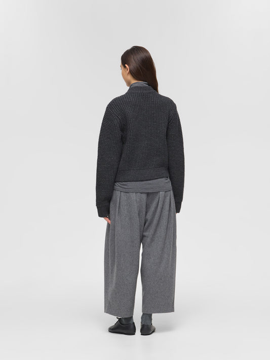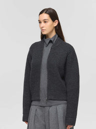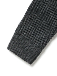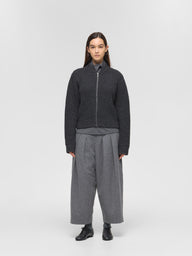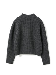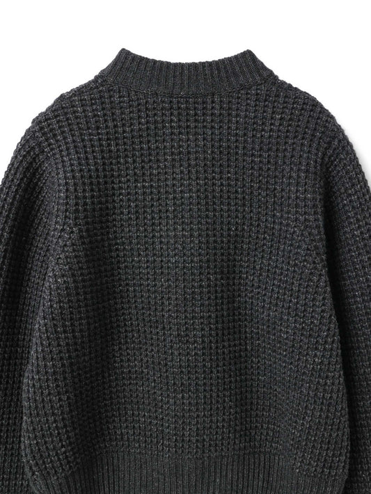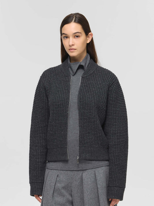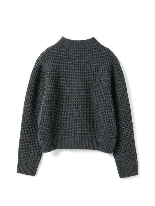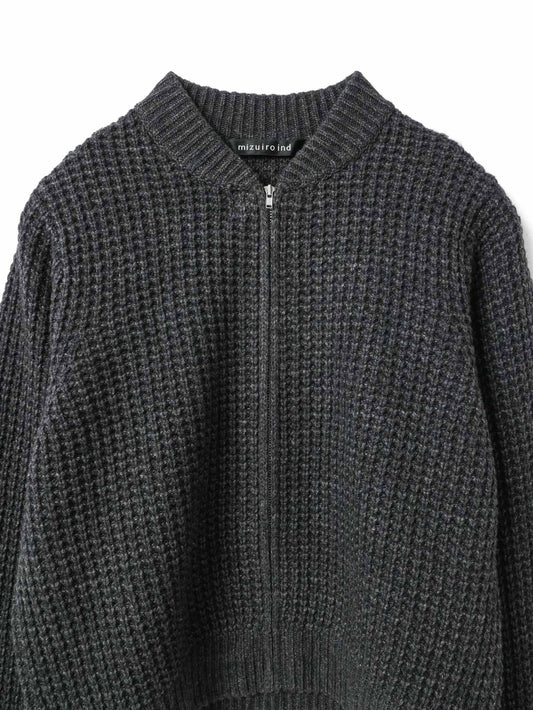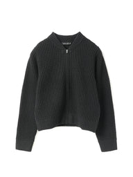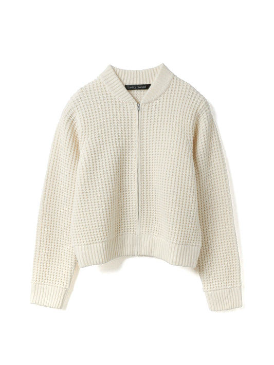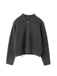 厚みのあるワッフル編みニットで仕立てた、シーズンムードを高めるジップブルゾン。ふっくらとした編地がほどよく空気を含み、保温性と軽さを両立。見た目にも温かみのある素材感が魅力です。ショート丈のコンパクトなシルエットに、肩まわりの適度なゆとりをプラス。リラックス感がありながらも、計算されたバランスでモードな印象を演出します。袖口と裾のリブが全体を引き締め、メリハリのあるシルエットに。裏地のない軽やかな仕立てで、アウターとしてもインナーとしても活躍。シンプルなデザインながら、着こなしに洗練された存在感を添えてくれる一枚です。同素材でハイネックベスト(4-220093 / waffle high neck vest)も展開。
