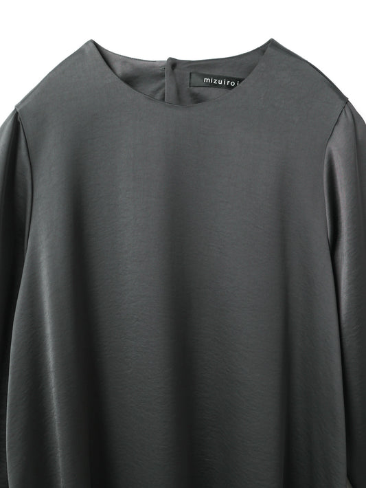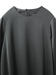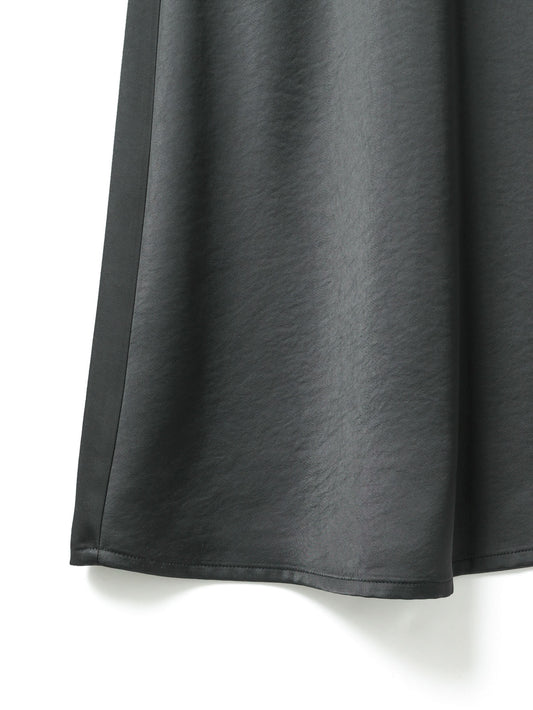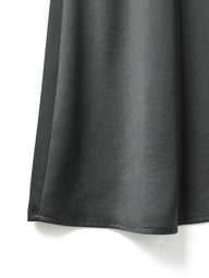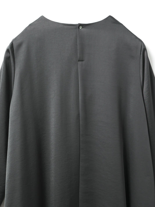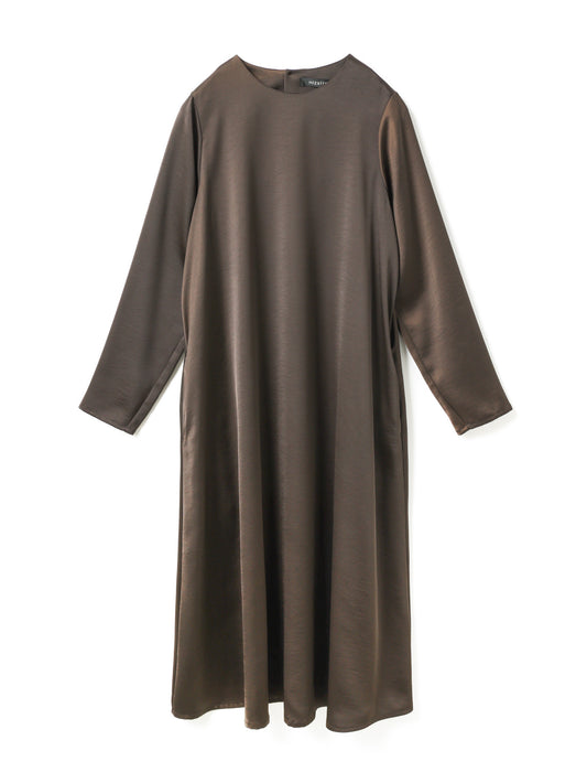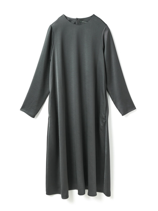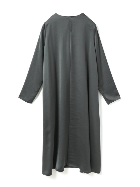 艶やかなヴィンテージサテンが美しいAラインワンピース。ミニマルで無駄のないデザインが、素材の上品さをいっそう引き立てます。肩まわりはすっきりと仕立てられ、裾に向かって緩やかに広がるフレアシルエットが優雅な印象。首の後ろのボタンで着脱できる仕様です。程よい厚みのあるヴィンテージサテンは、落ち感が美しく、寒い季節にも使いやすい素材感。オケージョンシーンにも映える華やかな一枚です。両サイドには便利なポケット付き。身長152cmでくるぶしの真上ほど、160cmで足首が見える丈感です。
