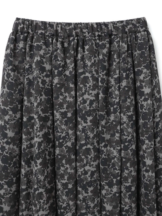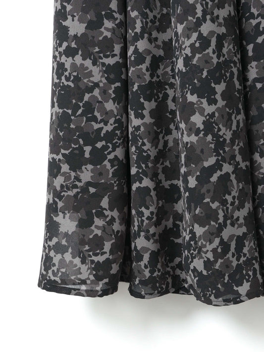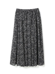 オリジナルのフラワープリントが目を惹くブラックフラワーシリーズのフレアロングスカート。軽やかな素材が動くたびにふわりと揺れ、シルエットそのものがスタイリングのポイントになります。ウエストはゴム仕様で、長時間の着用でもストレスを感じにくい快適な穿き心地です。素材には、ほのかな透け感が美しい軽やかなジョーゼットを使用。肌にやさしく馴染む上品な質感に加え、シボ感のある風合いが生地に奥行きを与え、プリントの表情をより一層引き立てます。日常のスタイリングにはもちろん、きれいめにまとめればオケージョンシーンにも映える、華やかさと上品さを兼ね備えた一枚です。サイドポケットなし。身長152cmジャストウエストで裾が床に少しつく丈。ハイウエストで穿くかヒールであわせたい。身長160cmジャストウエストでくるぶしが隠れる丈。裾の透け感でシューズ次第で印象が変わります。同シリーズワイドプルオーバー(4-230064 / flower print wide P/Oとセットアップもおすすめ。ワンピース( 4-250047 / flower print shirt OP)もございます。