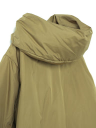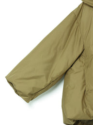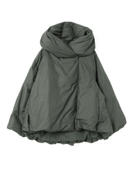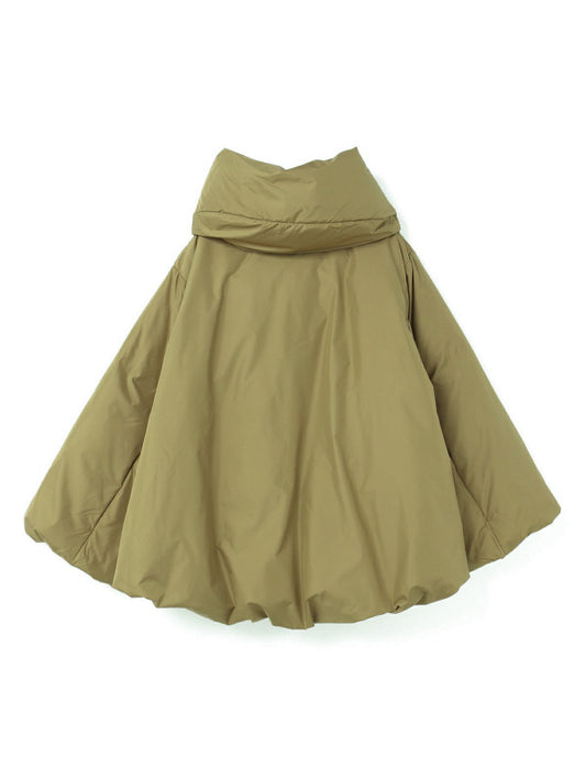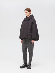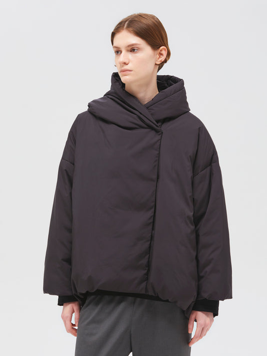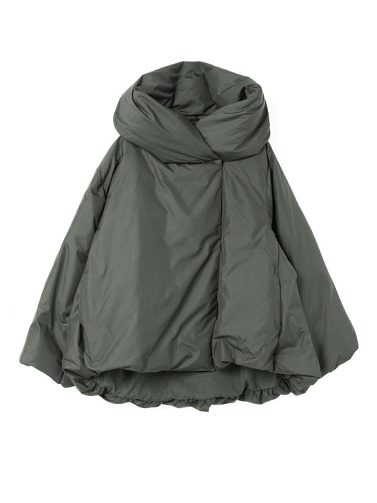 mizuiro ind 人気のフード付きショートダウン。後ろ下がりのフレアなシルエットで袖口と裾は内側に向けて丸みが出るように設計。ぷっくりとボリューム感のあるシルエットが印象的。フード部分にもボリュームを持たせています。ダブルボタンで前を合わせて着用するスタイル。前を開けたときにも目立たないよう同系色のスナップボタンを使用しています。ショート丈でボリュームのあるボトムスと好相性。ダウンとフェザーで温かさは抜群。スムースでほどよく光沢のある素材感。軽量で重くなりがちな冬のスタイルを軽やかにスタイリングできます。
