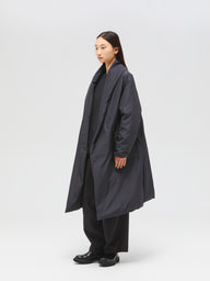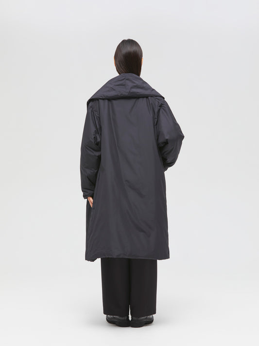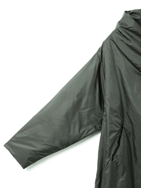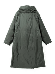 寒い冬の季節に暖かく身を包んでくれるドレープロングダウンコートです。マットなウォーム感のある光沢とタッチ、軽さと暖かさを兼ね備えたシックな雰囲気が印象的です。マフラー無しでも首元を暖かく覆ってくれるショールカラーが特徴。ドロップショルダーの落ち感のあるシルエットで温かなダウンコートでも雰囲気のある着こなしで着用いただけます。今季はポケットをミニマルなデザインに変更しボリュームのある少しフレアなシルエットにアップデートしました。前留めはスナップボタン仕様。前を開けたときもボタンが目立たず着用いただけます。
