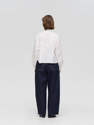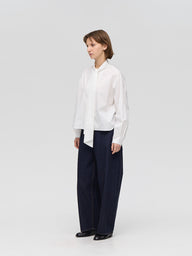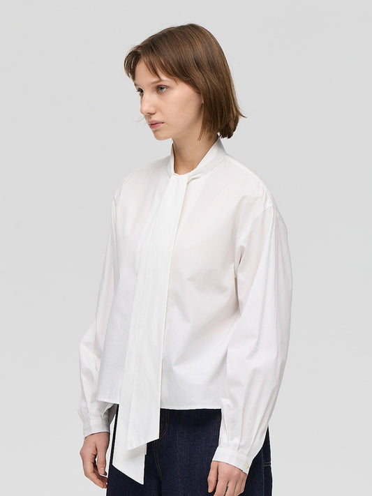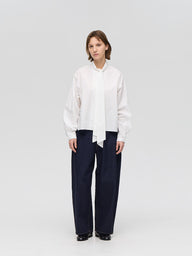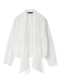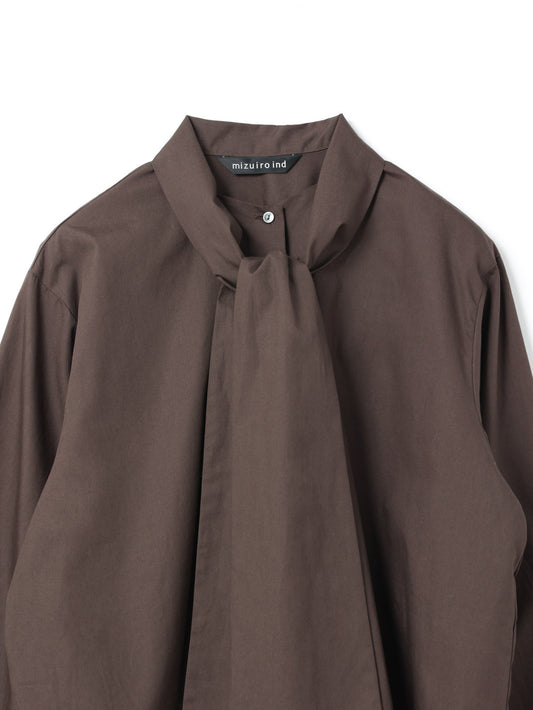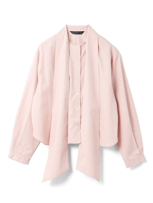 襟部分を長いタイでデザインしたロングタイカラーシャツ。タイの結び方次第で表情を変えられ、重ね着でも一枚着でも幅広く活躍します。ほどよくジャストなシルエットにショート丈を組み合わせ、レイヤードしやすく、単品でもバランスの取りやすい一枚。すっきりと仕上げたカフスデザインもさりげないポイントです。張りのあるコットンシャツ素材を使用。淡いカラーはやや透け感があります。