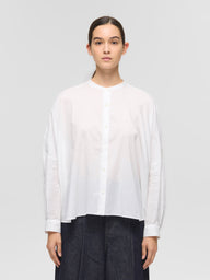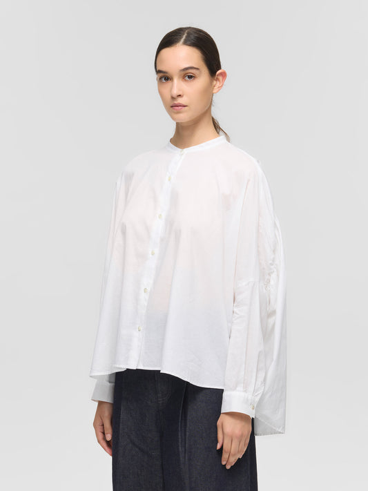 Mizuro Ind's classic and popular shirts and blouses. The front has a stand collar and a clean, simple style. The wide range of gathers on the back create a rounded silhouette that creates an impressive, atmosphere-like look. The very wide body width and shoulder-free style also have a rough silhouette that doesn't show the body lines. The right length with a difference in front and back. The round hem is what makes you femininity. Pair it with clean bottoms to create a neat style, or a generous and voluminous bottom, making it a silhouette that is easy to use, whether it's feminine or bottom. Light and transparent cotton loan material. It can be worn as a cover-up in the hot season, making it a great choice for a long season, such as wearing it as an inner layer in the cool season.