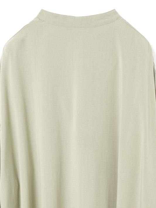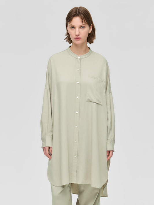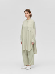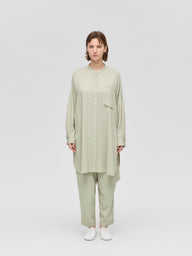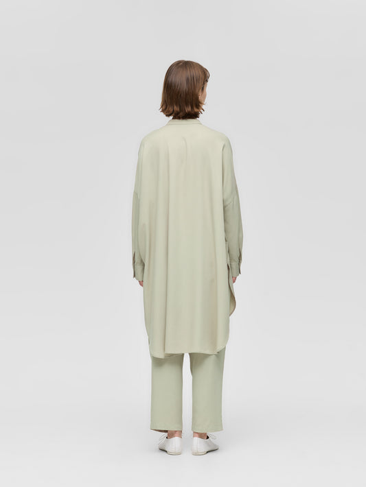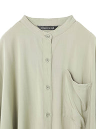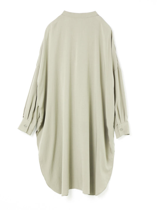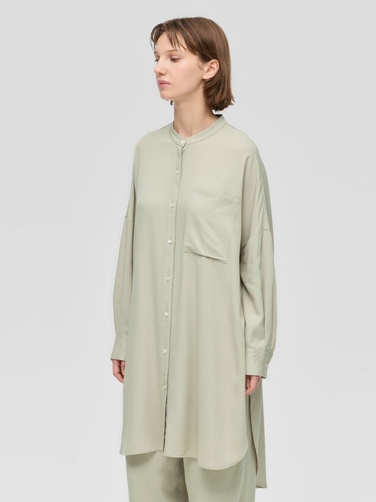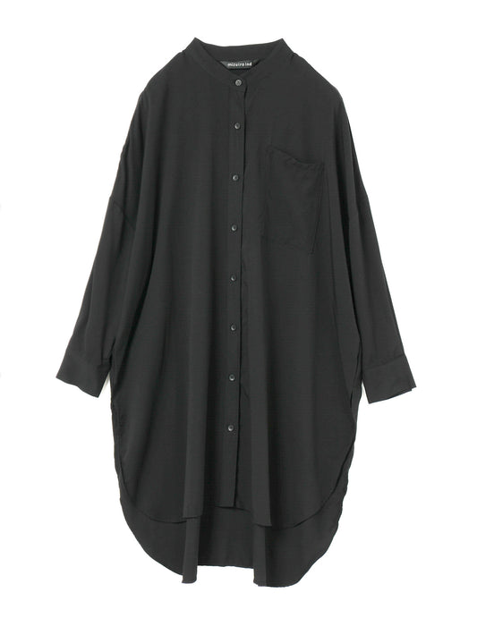 シワになりにくく、さらりとした肌触りが心地よいバンドカラーシャツです。mizuiro indで長く人気のあるデザインをベースに、ロングなチュニック丈が縦のラインをきれいに見せ、落ち着いた大人の雰囲気を引き立てます。大きく入ったサイドスリットが動きに軽やかさを与え、歩くたびに表情が生まれるのも魅力。ゆとりのあるシルエットで一枚でもレイヤードでも様になり、忙しい日でも気負わず着られる扱いやすさもポイントです。フロントボタンを開けて羽織りとしても楽しめ、着こなしの幅が広がります。相性のよい1-260106(T/Rタックイージーパンツ)とのセットアップスタイルもおすすめ。胸ポケット付きで実用性も備えた、日常に取り入れやすい一枚です。
