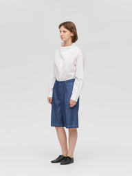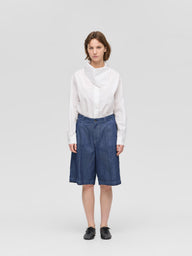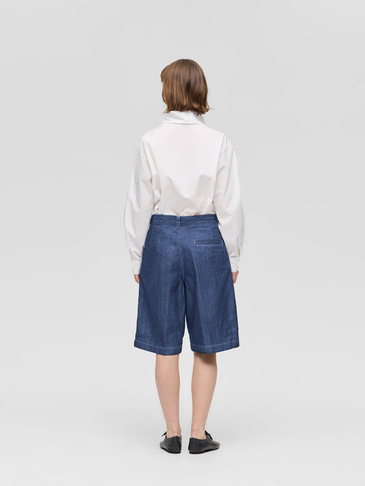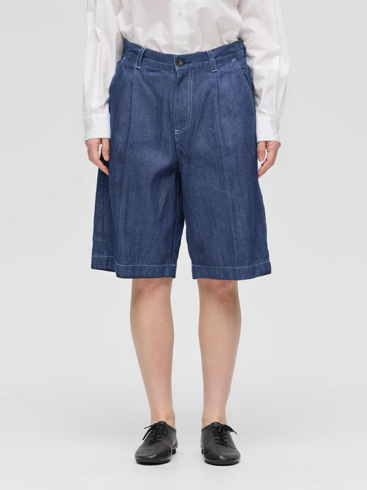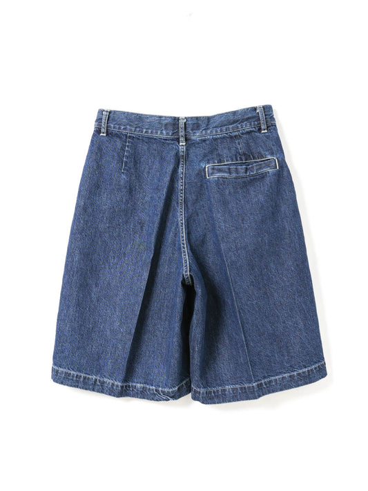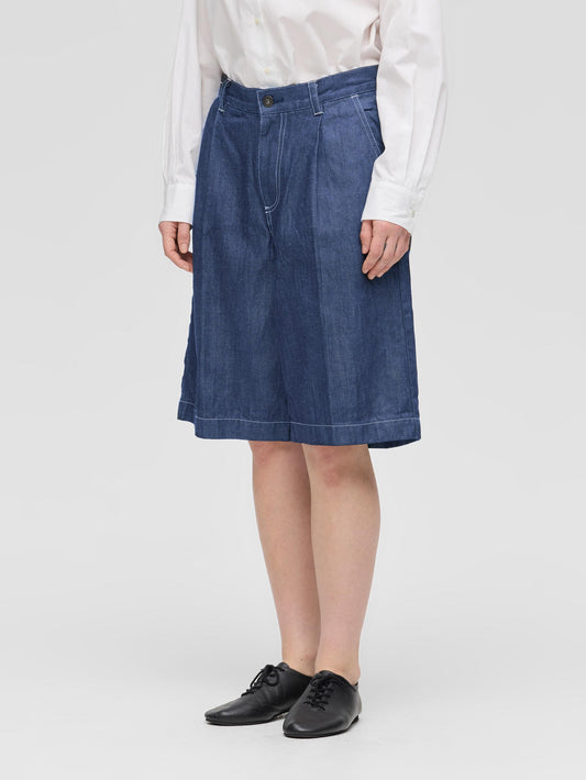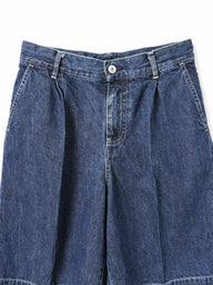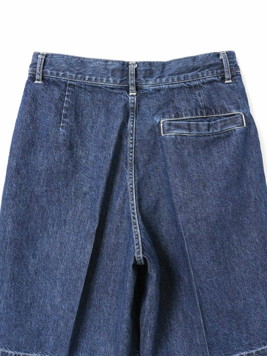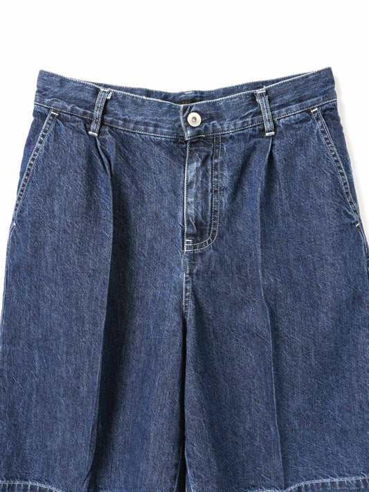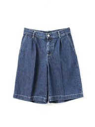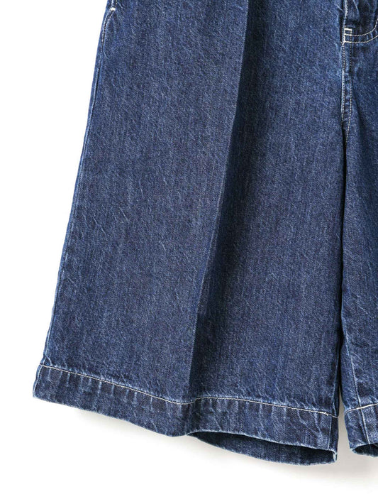 WaistThese shorts are made of casual denim material with a single tuck and center press, giving them a mature and elegant finish. It is knee-length and can be worn with a neat balance. The moderately roomy silhouette, which is equivalent to a size L, has an exquisite finish that is relaxed yet not too rough. Comes with belt loops to expand your styling options. The material is 10OZ denim, and it is comfortable to wear, neither too light nor too heavy, making it a piece that can be used for many seasons. Also available in one wash type (1-260095OW / denim half PT) in different colors. We also recommend pairing it with a coverall made of the same material (1-270039BL / wide denim coverall).
