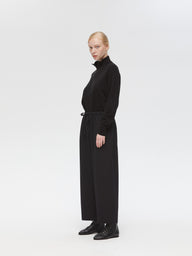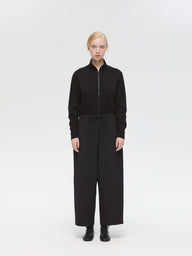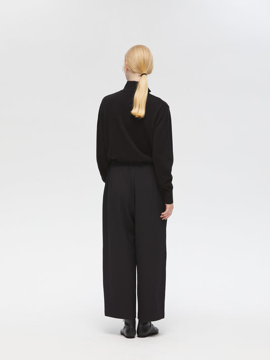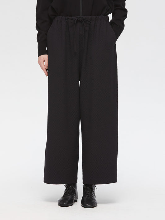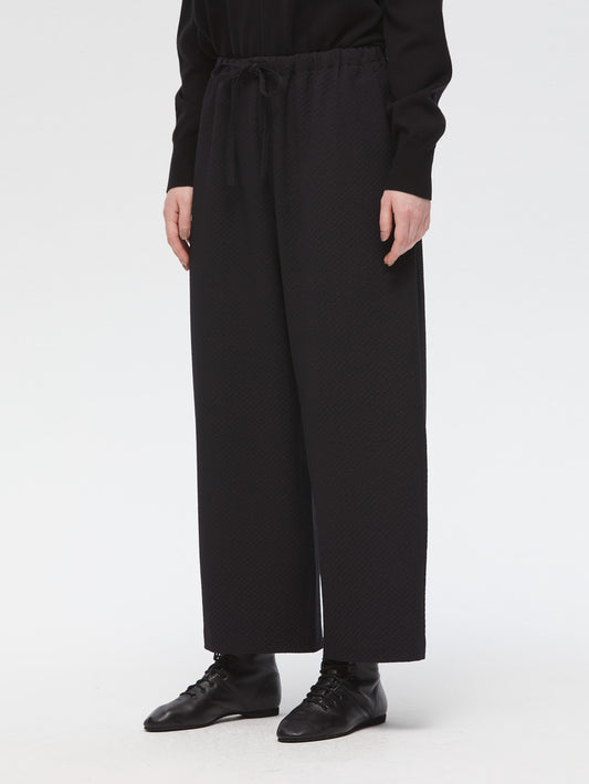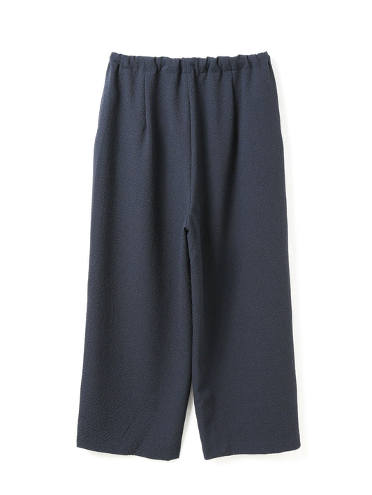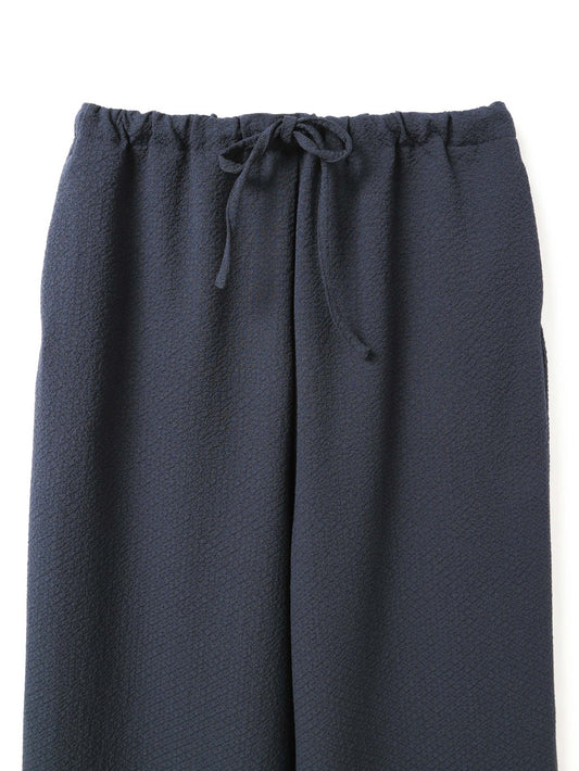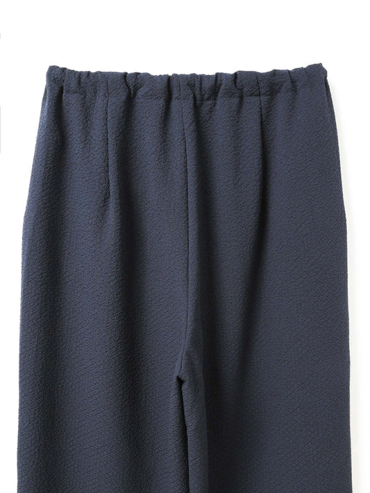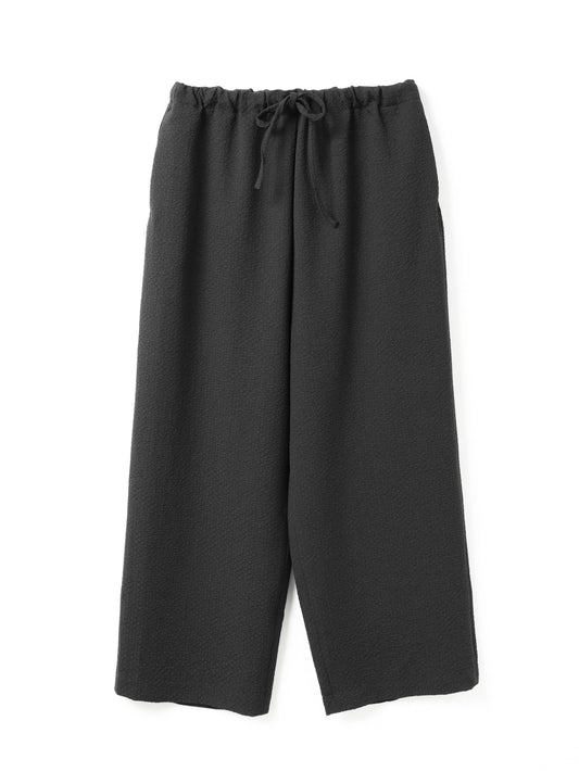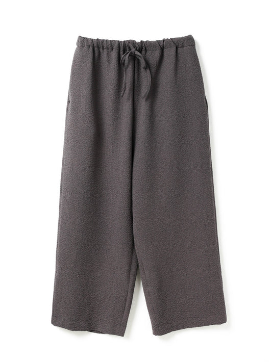 These easy pants are made from a unique jacquard fabric with a textured feel. The rich, deep look created by the unevenness on the surface is attractive. It is made of stretch material that stretches firmly in the vertical direction, and is soft and has a moderate tension, making it comfortable to wear and the silhouette is beautiful. Straight, just wide silhouette. It is designed to be full length.WaistThe elastic design gives it a good fit, and the drawstring ribbon adds a subtle accent to your outfit. Comes with side pockets. We also recommend combining it with a top (3-260076 / jacquard easy PT) made from the same material in an all-in-one style.