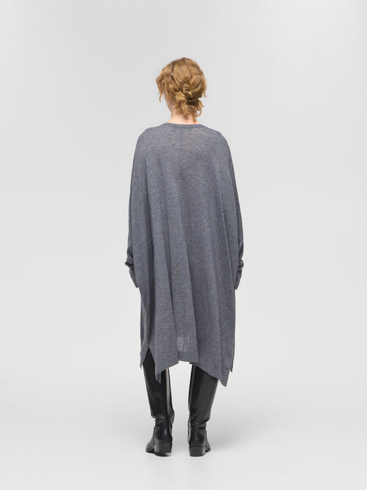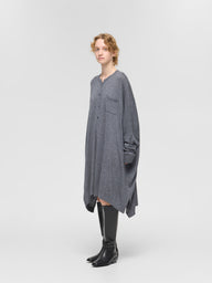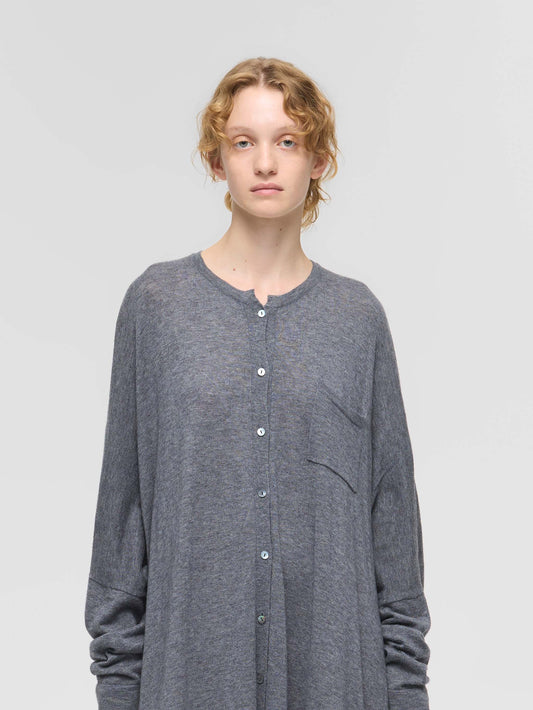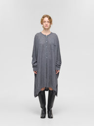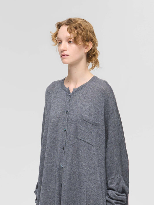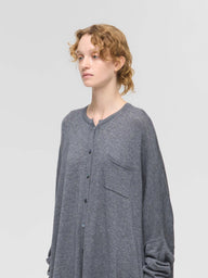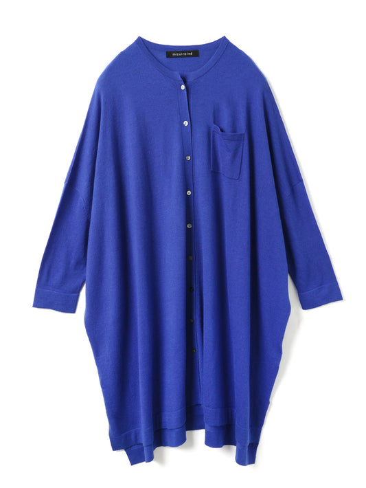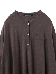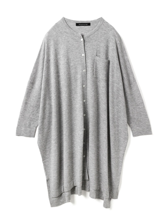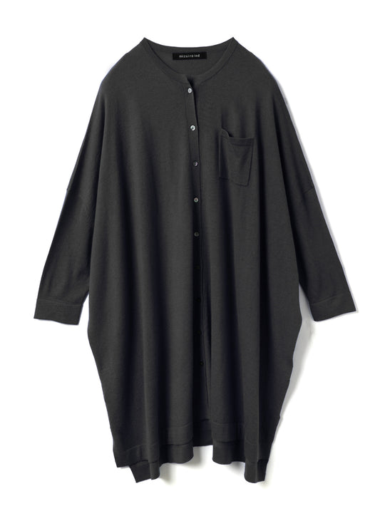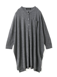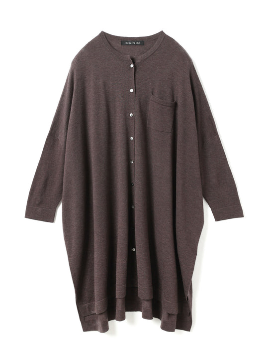 A popular knit returns this season — a knit long cardigan dress featuring a chest pocket accent. The sharp stand collar and softly draped, wide silhouette on the sides create a clean yet relaxed look. With side slits and a high-low hem, it’s perfect for layered styling. Can be worn as a long cardigan or as a dress. Made from a soft, fine-gauge knit with a smooth texture, blended with wool for warmth and comfort. The same series also includes a short cardigan (4-220105 / crew neck short C/D) and a knit pullover (4-220101 / poncho like P/O).