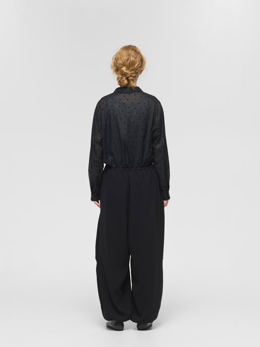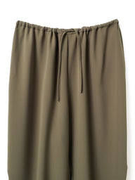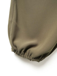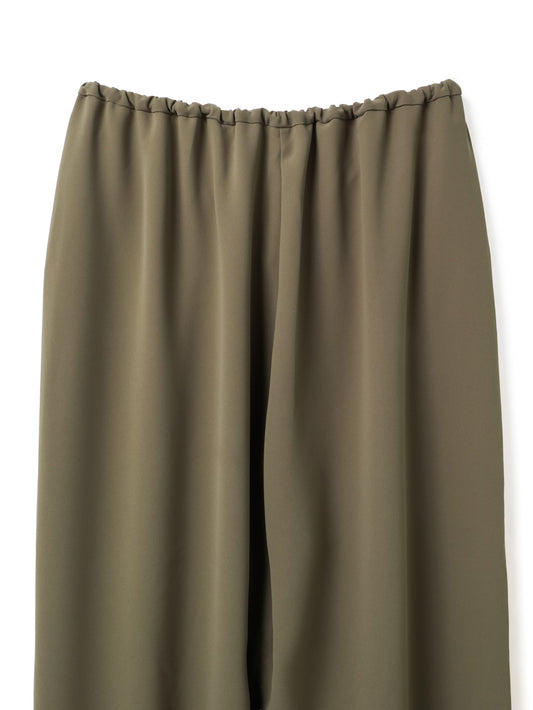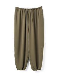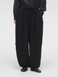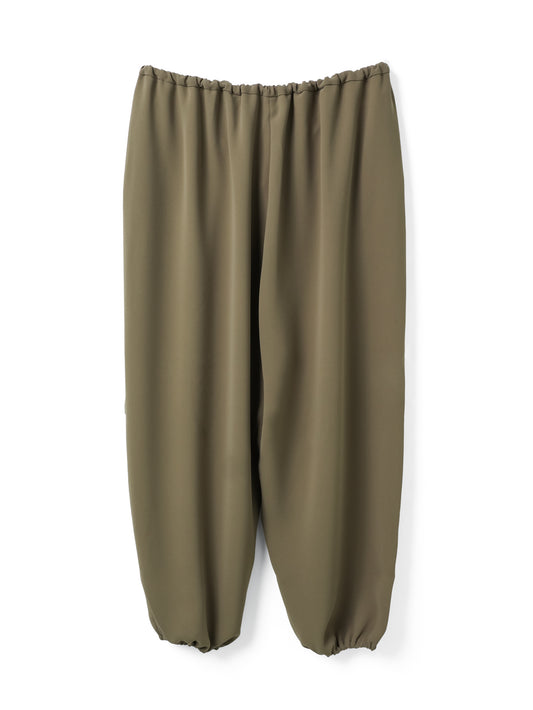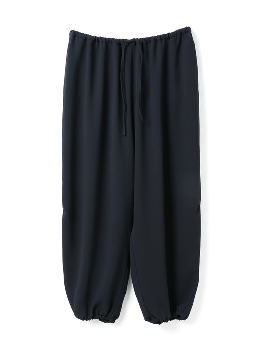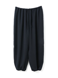 裾にゴムを施した、丸みのあるシルエットが特徴のパンツです。ひざ部分のサイドに入れたタックにより、ゆったりとしたワイドなシルエットでありながらも広がりすぎず、ほどよい落ち感のあるラインに仕上げています。ウエストはゴム仕様に加え、ドロストコードでサイズ調整が可能。ギャザーを寄せることで、リラックス感のある着心地の中にも美しいドレープが生まれ、動きのあるスタイルを演出します。裾のゴムで丈を軽く止められるため、低身長の方にもバランスよく着用していただけます。素材には、ふくらみと程よいハリ感を兼ね備えたダブルクロスを使用。しなやかで上品な質感が特徴で、防シワ性があり型崩れしにくく、長時間の着用でもきれいなシルエットを保ちます。さらにストレッチ性にも優れているため動きやすく、快適な履き心地を実現します。ほどよい厚みのある生地感で、ロングシーズン活躍。ゆったりとしたサイズ感で、冬にはレギンスやタイツなどを中に着込むこともでき、季節に合わせた着こなしが楽しめます。裏地なし。サイドポケット付き。同素材でシャツ(4-230056 / blouson like shirt)も展開。セットアップもお勧めです。
