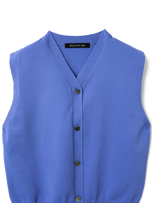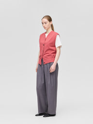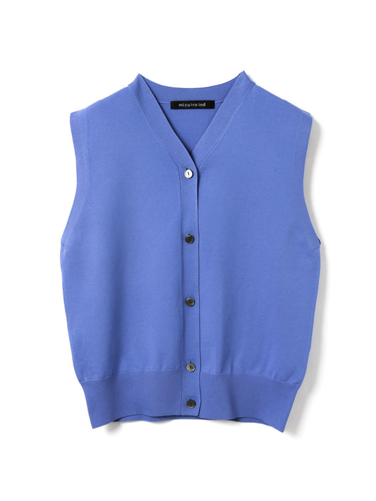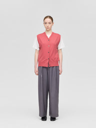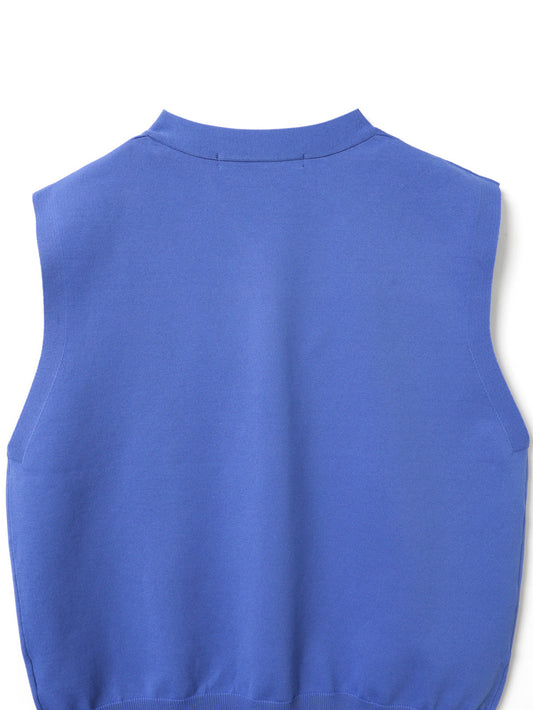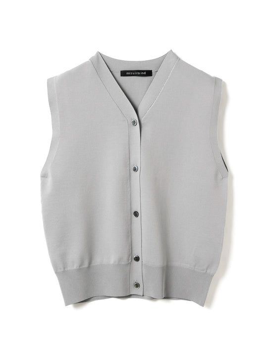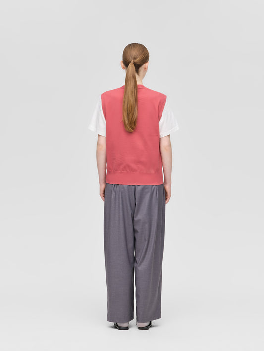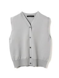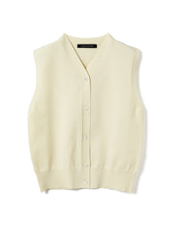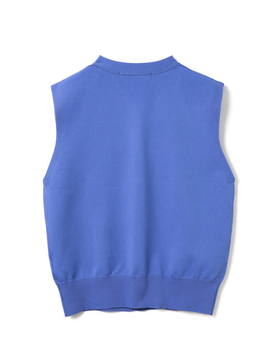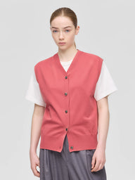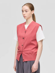 メンズライクなデザインをベースにしたVネックベストです。浅めに設計したネックラインが上品でクラシックな雰囲気を引き立て、装いに程よいきちんと感を添えます。無駄を削ぎ落としたシンプルなデザインは合わせるアイテムを選ばず、日常のコーディネートに自然と馴染む一枚。程よくジャストなサイジングでも身体のラインを拾いすぎず、軽やかなレイヤードスタイルを楽しめます。裾の太めのリブはブラウジングしてシルエットに変化をつけたり、ボタンの開閉で表情の違いを楽しめるのも魅力。素材にはポリエステルニットを使用し、さらりとした肌触りと軽さ、シワになりにくい扱いやすさが特徴です。装いのアクセントになる明るいカラーが、落ち着いた印象の中にさりげない華やかさを添え、季節感のある着こなしを引き立てます。気軽に取り入れやすく、幅広いスタイリングで活躍するベストです。