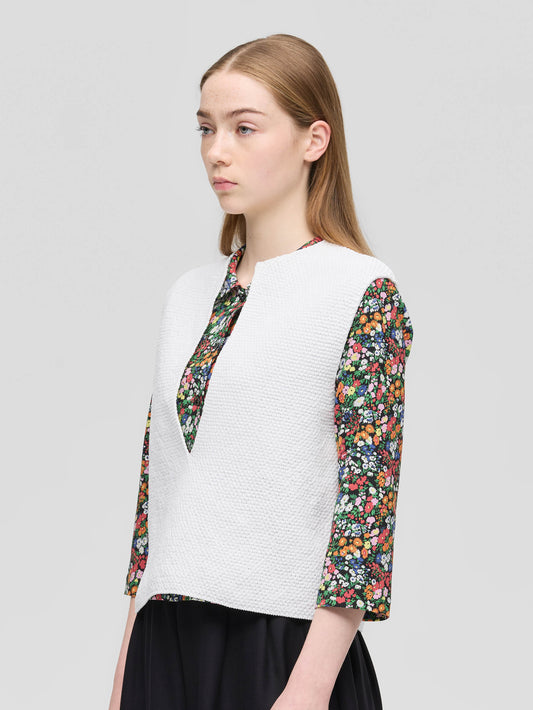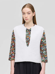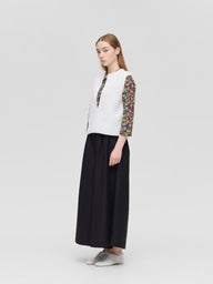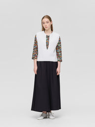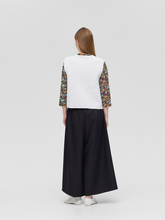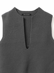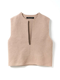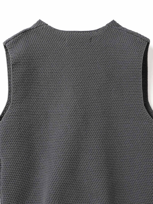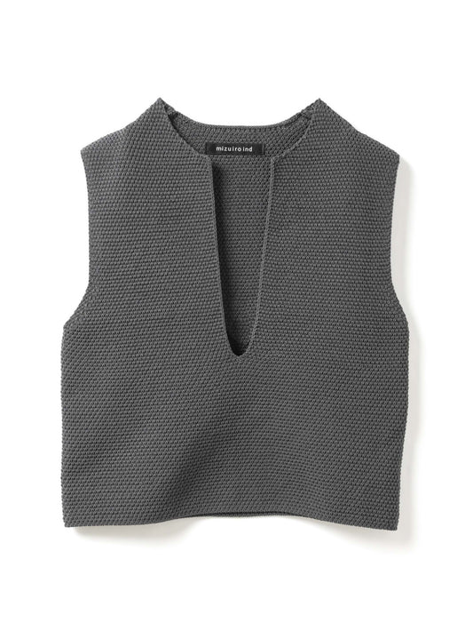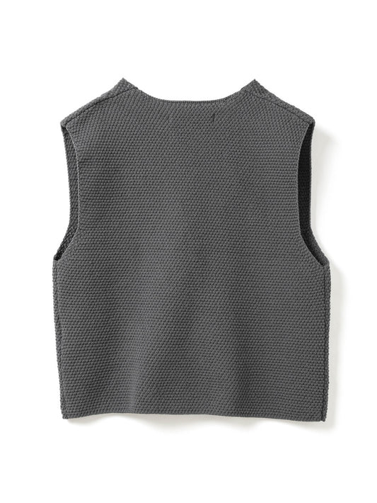 スポンジリリーヤーンを使用したVネックベスト。軽やかさがありながら、厚みのあるぽこぽことした立体的な編み地が特徴です。丸みのある深めのVネックがレイヤードスタイルに映え、インナーとの組み合わせを楽しめるデザイン。ジャストなサイジングとショート丈のバランスで、ワイドボトムスやスカートとも好相性です。伸縮性に優れたポリエステルニット素材を使用し、見た目のボリュームに反して軽い着心地も魅力。適度な厚みがあり、コーディネートの主役としてもレイヤードアイテムとしても活躍する一枚です。同素材でハーフスリーブプルオーバー(1-220076 / short wide P/O)も展開。