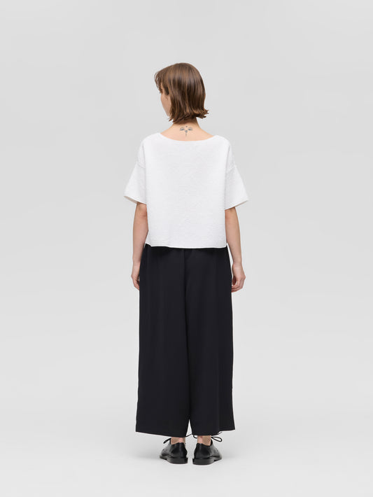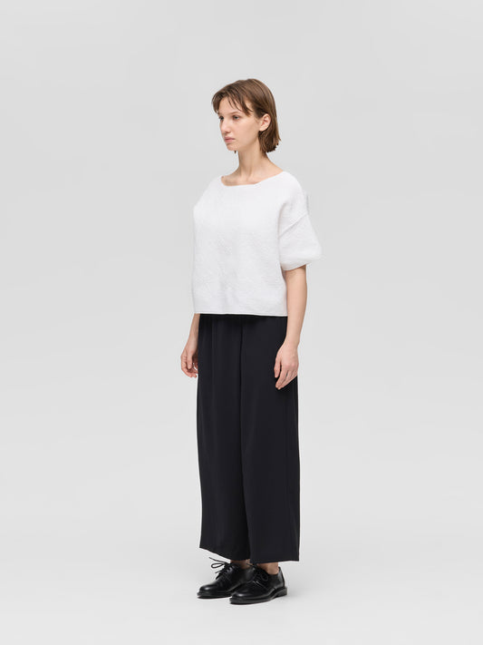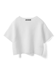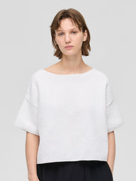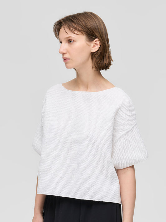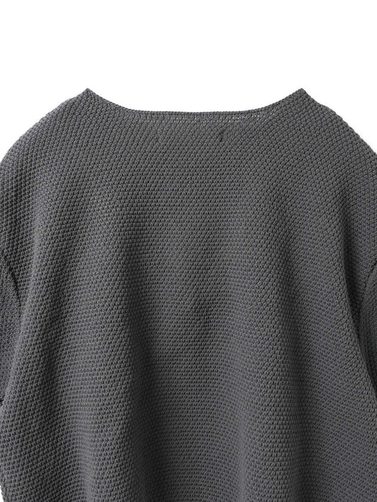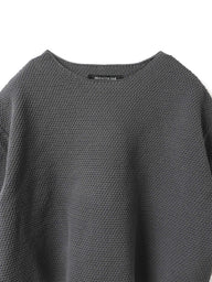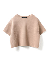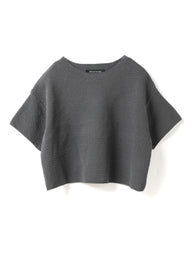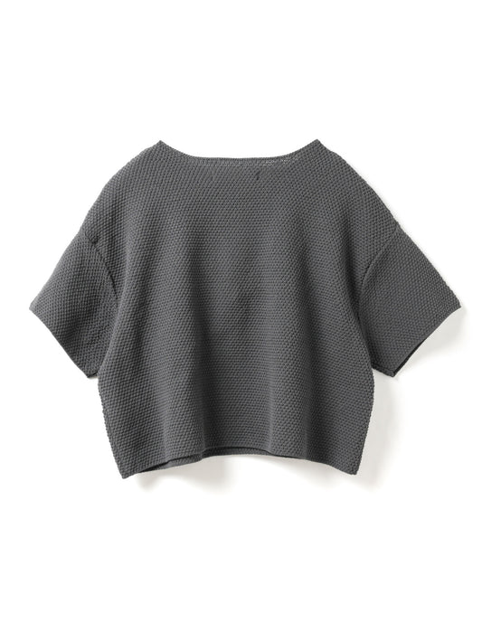スポンジリリーヤーンを使用したショートワイドプルオーバー。軽やかさがありながら、厚みのあるぽこぽことした立体的な編み地が特徴です。ショート丈×ワイドシルエットのバランスで、落ち感がありつつもすっきりとした印象に。ボトムスを選ばず合わせやすく、スタイリングに抜け感をプラスします。ハーフスリーブデザインでレイヤードもしやすく、季節の変わり目から長く活躍。ネックは浅めのクルーネックで上品な印象に仕上げました。伸縮性に優れたポリエステルニット素材を使用し、見た目のボリュームに反して軽い着心地も魅力。適度な厚みがあり、コーディネートの主役になる一枚です。同素材でベスト(1-220075 / deep V neck vest)も展開。
