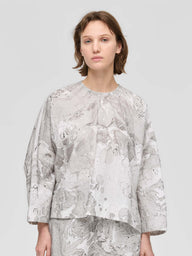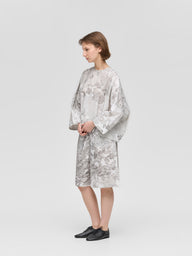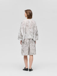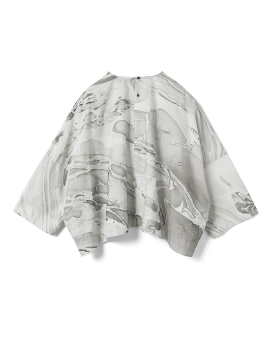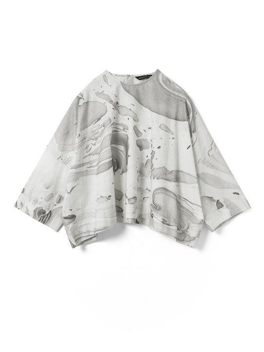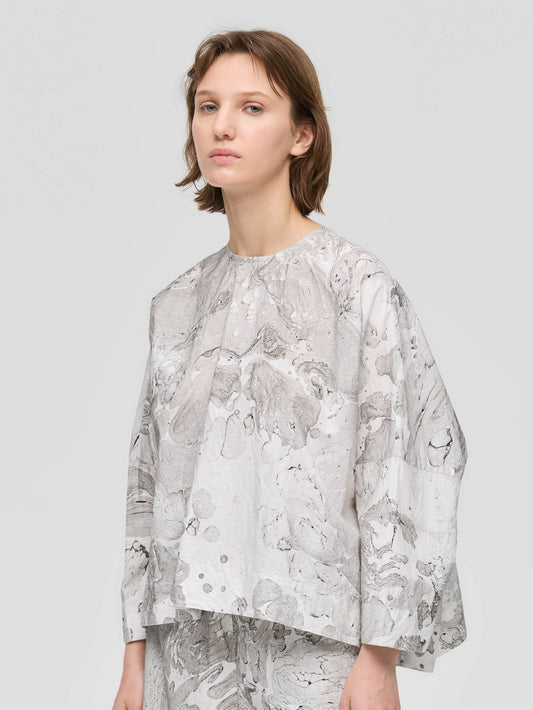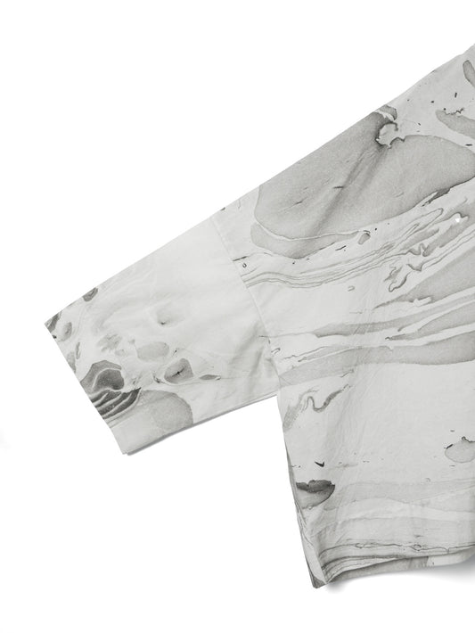 ダイナミックなマーブリングプリントが目を引くトップスです。インクを水面に落として描く手作業ならではの柄は、一点ごとに異なる表情を持ち、装いにアートのような奥行きを添えます。幅広の袖とゆとりのあるシルエットが動きに合わせてやわらかく広がり、存在感のあるプリントでも日常のスタイリングにも取り入れやすい一枚です。長過ぎず程よい丈感でボトムスを問わず合わせやすいシルエット。後ろボタンで着脱する仕様です。ほどよく張りがありながらナチュラルな質感のコットン素材でふわりとしたシルエットがきれいに出ながらやわらかな着心地。色止め加工を施しているためご自宅での洗濯も可能。着るたびに個性を楽しめる、表情豊かなアイテムです。同素材でシャツワンピース(1-250081 / marble print tunic OP)とキュロットパンツ(1-260097 / marble print culotte PT)も展開しています。