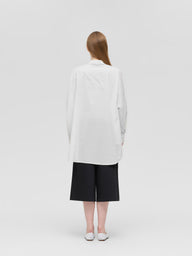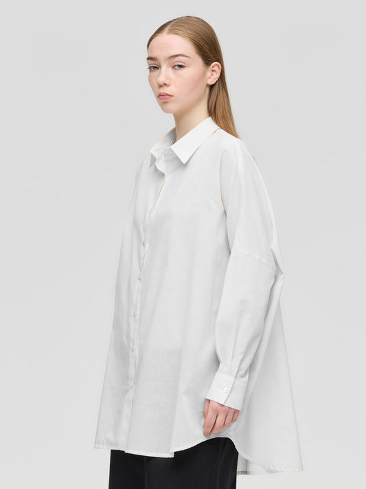 しわになりにくく、ややハリのある綿混素材を使用した、オーバーサイズのシアーボリュームシャツ。空気を含んだような立体的なシルエットが印象的で、身体のラインを拾わず動くたびに軽やかに揺れる生地感が華奢見せを叶えます。ほどよい透け感がビッグシルエットに抜け感を与え、重たく見せずスタイリッシュな印象。深めのサイドスリットが腰回りをすっきり見せ、タイトなボトムスとも好相性です。や丸みのあるフォルムもポイント。さっと羽織るだけでスタイリングが決まり、レイヤードも楽しめる一着。や日常の装いに軽やかな変化を添えてくれます。