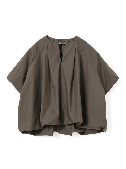 たっぷりと丸みのあるバルーンシルエットが印象的なブラウスです。裾に向かって丸みを持たせたっぷりとした立体的なフォルムが特徴。後ろ身頃にはギャザーを施し、動くたびに自然なボリュームが生まれるデザインです。スタイリッシュなノーカラーネックが首元をすっきりと見せ、程よく幅広のネック周りで、さりげない抜け感をつくります。ハーフスリーブで、レイヤードなど春先から夏までロングシーズン着用可能。前後差をつけたショート丈で、ボリュームのあるシルエットも今っぽいバランスが作りやすいデザインに仕上げています。素材には張りのあるコットン素材を使用し、バルーンシルエットをきれいにキープしながら、着心地の良さも実現。シンプルながら存在感のある一枚です。