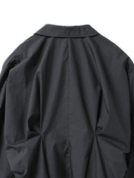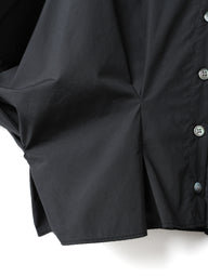 シャツとジャケットの中間のような存在感をもつ、立体的なデザインシャツ。ウエストに施したタックが生み出す構築的なフォルムが、自然なウエストシェイプをつくり、ペプラムのような立体感のあるメリハリの効いたシルエットを演出します。肩の切替位置を肘上あたりまで落とすことでほどよい落ち感が生まれ、ドルマンスリーブのような丸みのある独特なフォルムに。幅広に設定したカフスが全体を引き締め、甘さの中にきちんと感をプラスしています。ショート丈のバランスで、シャツとしてはもちろん軽いジャケット感覚でも着用できる一枚で、コーディネートに立体感と新鮮さを加えてくれます。素材には60タイプライター生地を使用。高密度ながら軽やかさを持ち、洗い仕上げによって程よく力の抜けた風合いで、天日干し風のナチュラルな表情が加わることで、かっちりしすぎず日常に馴染む雰囲気に。一枚着としても羽織りとしても活躍し、シーズンをまたいで長く使えるアイテムです。ポケットなし 。オフホワイトはやや透け感がございます。