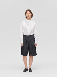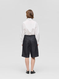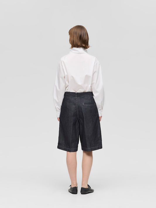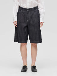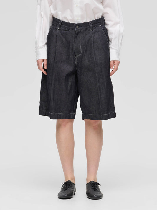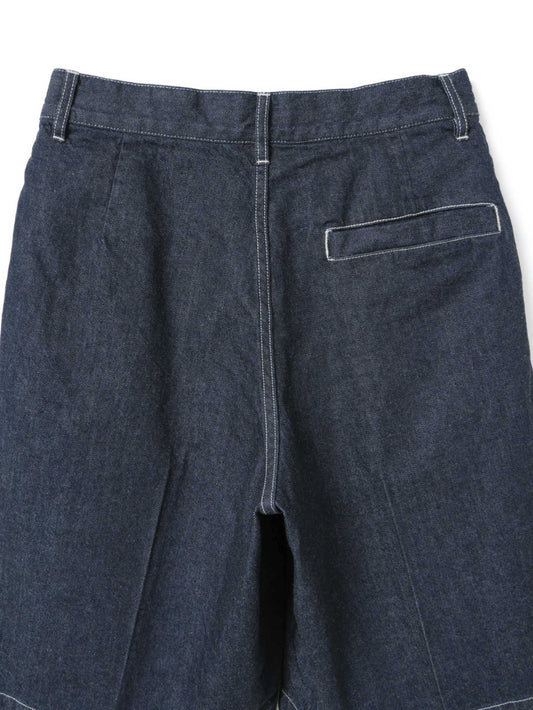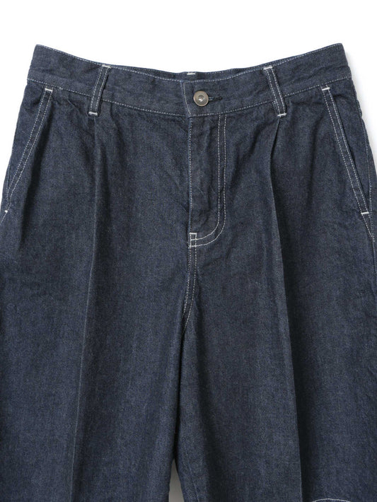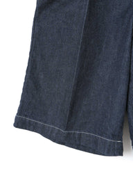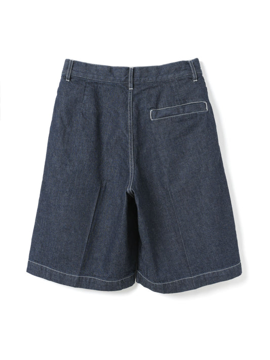 ウエストにワンタックとセンタープレスを施し、カジュアルなデニム素材ながらも大人っぽく上品に仕上げたハーフパンツ。膝丈で、すっきりとしたバランスで着用できます。程よくゆとりのあるLサイズ相当のシルエットは、リラックス感がありながらもラフになりすぎない絶妙な仕上がり。ベルトループ付きでスタイリングの幅も広がります。素材には10OZデニムを使用し、軽すぎず重すぎないちょうど良い穿き心地で、ロングシーズン活躍する一本です。色違いのブリーチタイプ(1-260095BL / denim half PT)も展開。同素材のカバーオール(1-270039OW / wide denim coverall)とセットアップもおすすめ。