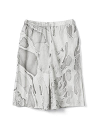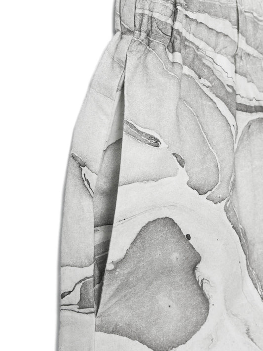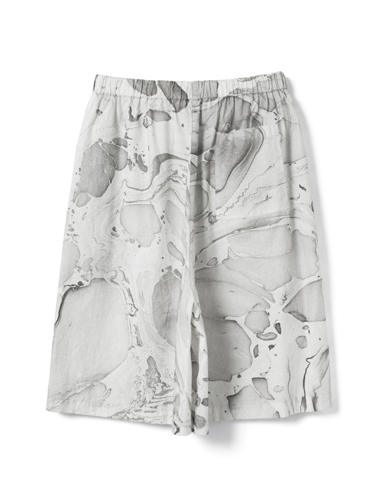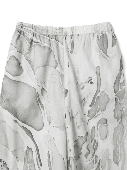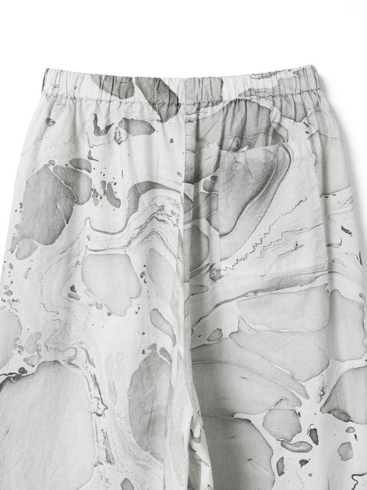 ダイナミックなマーブリングプリントが印象的なキュロットパンツです。インクを水面に落として描く手作業ならではの柄は一点ごとに異なる表情を持ち、装いにアートのような奥行きを添えます。スカートのように見えるゆとりのあるシルエットが軽やかな動きをつくり、身体のラインを拾いすぎないリラックス感も魅力。存在感のあるプリントながら落ち着いたトーンで合わせやすく、日常のスタイリングにも自然と馴染みます。ウエストはゴムとドロストコード仕様で調整しやすく、股上を深めに設計することで安心感のある穿き心地に。ほどよく張りがありながらナチュラルな風合いのコットン素材で綺麗なシルエットを保ちながら着心地の良さを体感いただけます。色止め加工を施しているためご自宅での洗濯が可能。裏地なし。透け感はプリント柄で少なめです。同素材でプルオーバー(1-230146 / marble print wide P/O)とシャツワンピース(1-250081 / marble print tunic OP)も展開しています。
