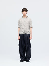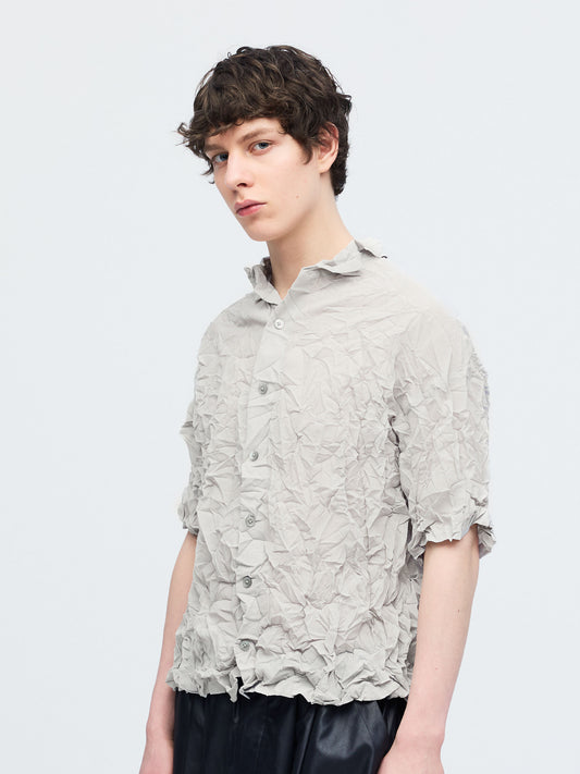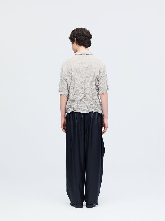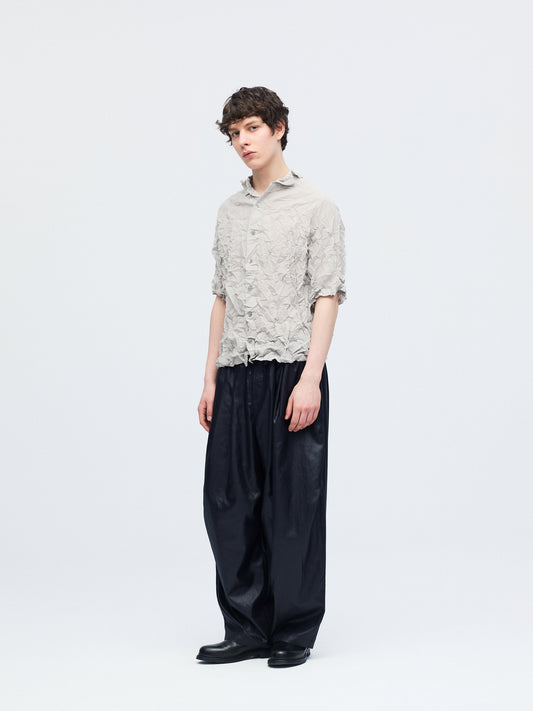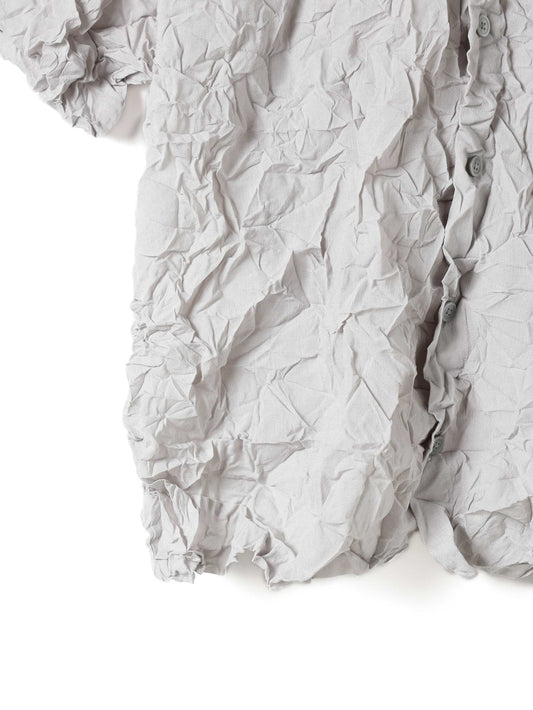 細やかなプリーツと立体的なワッシャー加工を施した、表情豊かなワッシャープリーツシャツです。生地全体に動きのあるシワ感を持たせることで、シンプルなデザインの中に奥行きをプラス。程よい透け感が軽やかな印象を生み、ミニマルな襟元が全体をすっきりと引き締めます。ニュアンスのある質感が際立つ一枚です。